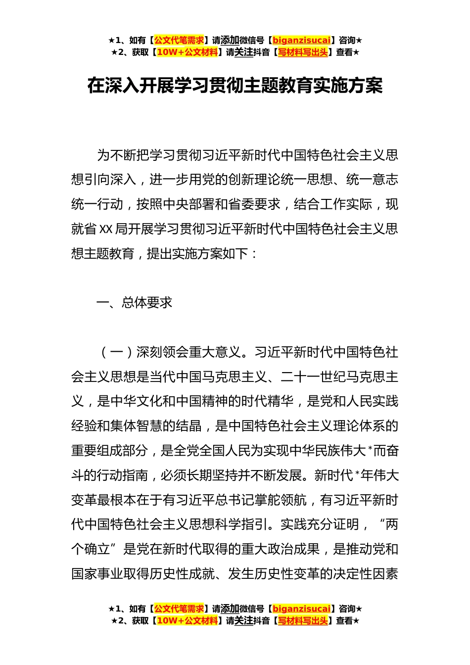 ★1、如有【公文代笔需求】请添加微信号【biganzisucai】咨询★★2、获取【10W+公文材料】请关注抖音【写材料写出头】查看★在深入开展学习贯彻主题教育实施方案为不断把学习贯彻习近平新时代中国特色社会主义思想引向深入,进一步用党的创新理论统一思想、统一意志统一行动,按照中央部署和省委要求,结合工作实际,现就省XX局开展学习贯彻习近平新时代中国特色社会主义思想主题教育,提出实施方案如下:一、总体要求(一)深刻领会重大意义。习近平新时代中国特色社会主义思想是当代中国马克思主义、二十一世纪马克思主义,是中华文化和中国精神的时代精华,是党和人民实践经验和集体智慧的结晶,是中国特色社会主义理论体系的重要组成部分,是全党全国人民为实现中华民族伟大*而奋斗的行动指南,必须长期坚持并...
