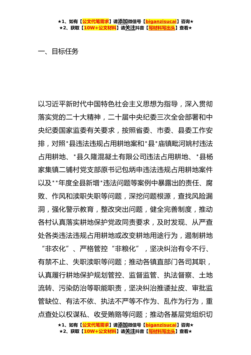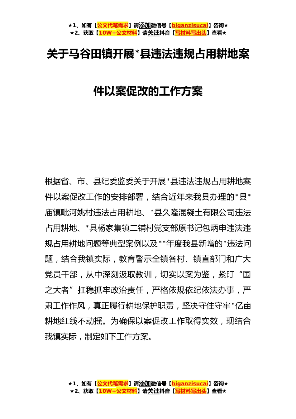 ★1、如有【公文代笔需求】请添加微信号【biganzisucai】咨询★★2、获取【10W+公文材料】请关注抖音【写材料写出头】查看★关于马谷田镇开展*县违法违规占用耕地案件以案促改的工作方案根据省、市、县纪委监委关于开展*县违法违规占用耕地案件以案促改工作的安排部署,结合近年来我县办理的*县*庙镇毗河姚村违法占用耕地、*县久隆混凝土有限公司违法占用耕地、*县杨家集镇二铺村党支部原书记包炳申违法违规占用耕地问题等典型案例以及**年度我县新增的*违法问题,结合我镇实际,教育警示全镇各村、镇直部门和广大党员干部,从中深刻汲取教训,切实以案为鉴,紧盯“国之大者”扛稳抓牢政治责任,严格依规依纪依法办事,严肃工作作风,真正履行耕地保护职责,坚决守住守牢*亿亩耕地红线不动摇。为确保以案促改工作...