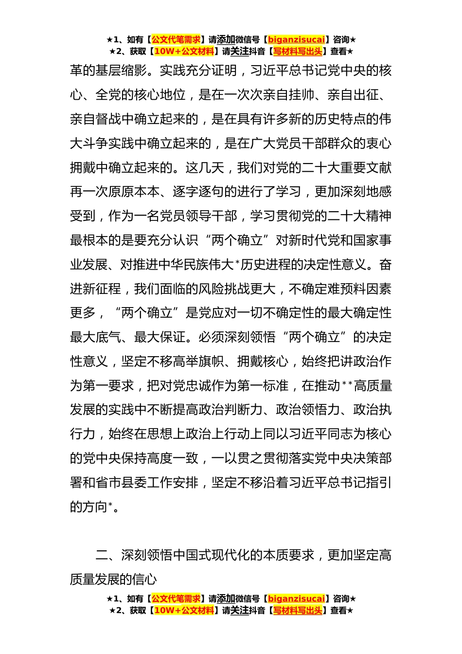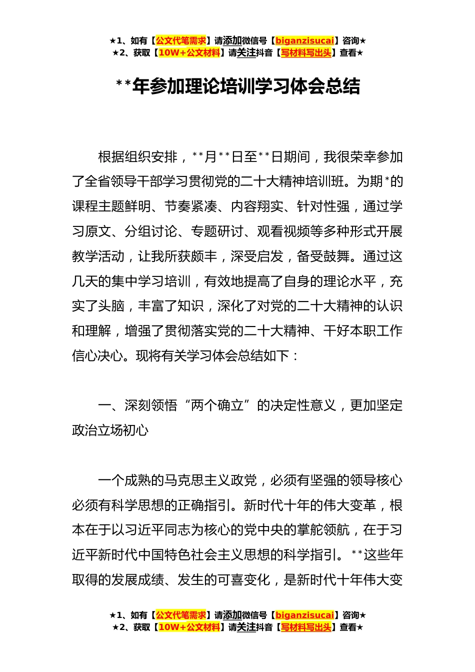 ★1、如有【公文代笔需求】请添加微信号【biganzisucai】咨询★★2、获取【10W+公文材料】请关注抖音【写材料写出头】查看★**年参加理论培训学习体会总结根据组织安排,**月**日至**日期间,我很荣幸参加了全省领导干部学习贯彻党的二十大精神培训班。为期*的课程主题鲜明、节奏紧凑、内容翔实、针对性强,通过学习原文、分组讨论、专题研讨、观看视频等多种形式开展教学活动,让我所获颇丰,深受启发,备受鼓舞。通过这几天的集中学习培训,有效地提高了自身的理论水平,充实了头脑,丰富了知识,深化了对党的二十大精神的认识和理解,增强了贯彻落实党的二十大精神、干好本职工作信心决心。现将有关学习体会总结如下:一、深刻领悟“两个确立”的决定性意义,更加坚定政治立场初心一个成熟的马克思主义政党,必...