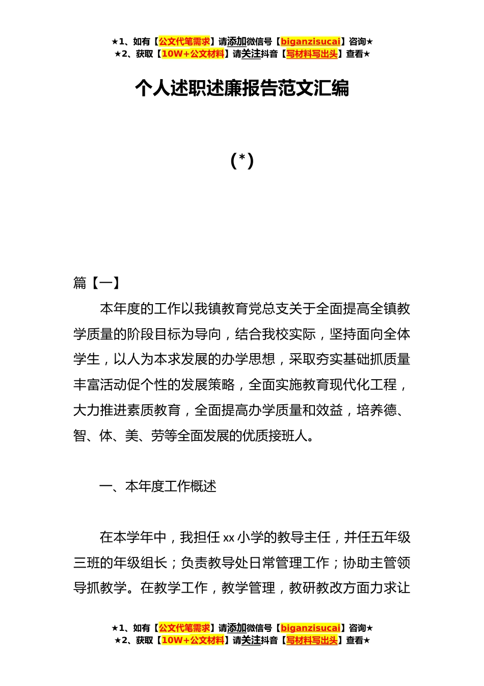 ★1、如有【公文代笔需求】请添加微信号【biganzisucai】咨询★★2、获取【10W+公文材料】请关注抖音【写材料写出头】查看★个人述职述廉报告范文汇编(*)篇【一】本年度的工作以我镇教育党总支关于全面提高全镇教学质量的阶段目标为导向,结合我校实际,坚持面向全体学生,以人为本求发展的办学思想,采取夯实基础抓质量丰富活动促个性的发展策略,全面实施教育现代化工程,大力推进素质教育,全面提高办学质量和效益,培养德、智、体、美、劳等全面发展的优质接班人。一、本年度工作概述在本学年中,我担任xx小学的教导主任,并任五年级三班的年级组长;负责教导处日常管理工作;协助主管领导抓教学。在教学工作,教学管理,教研教改方面力求让★1、如有【公文代笔需求】请添加微信号【biganzisucai】咨询★★2...