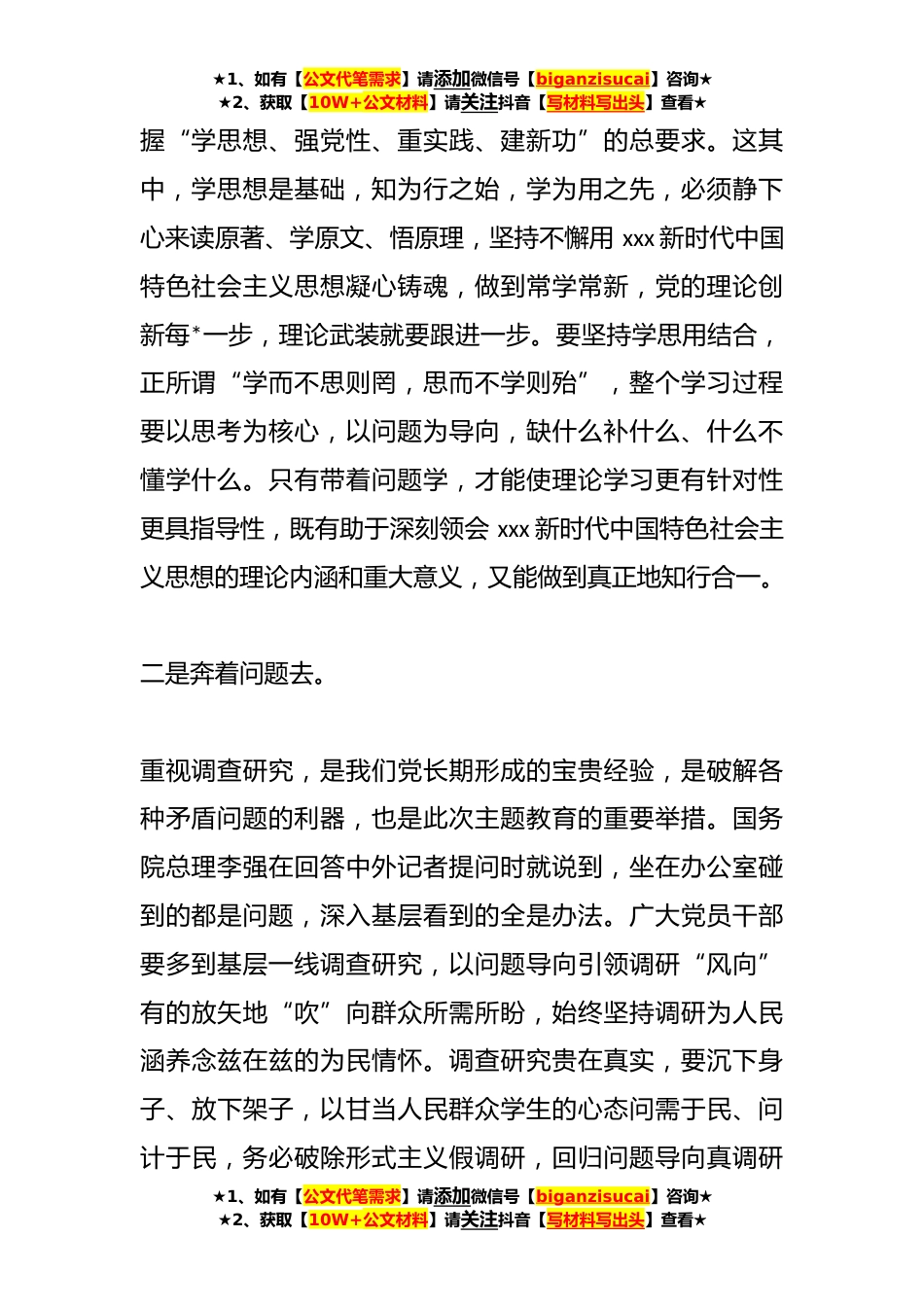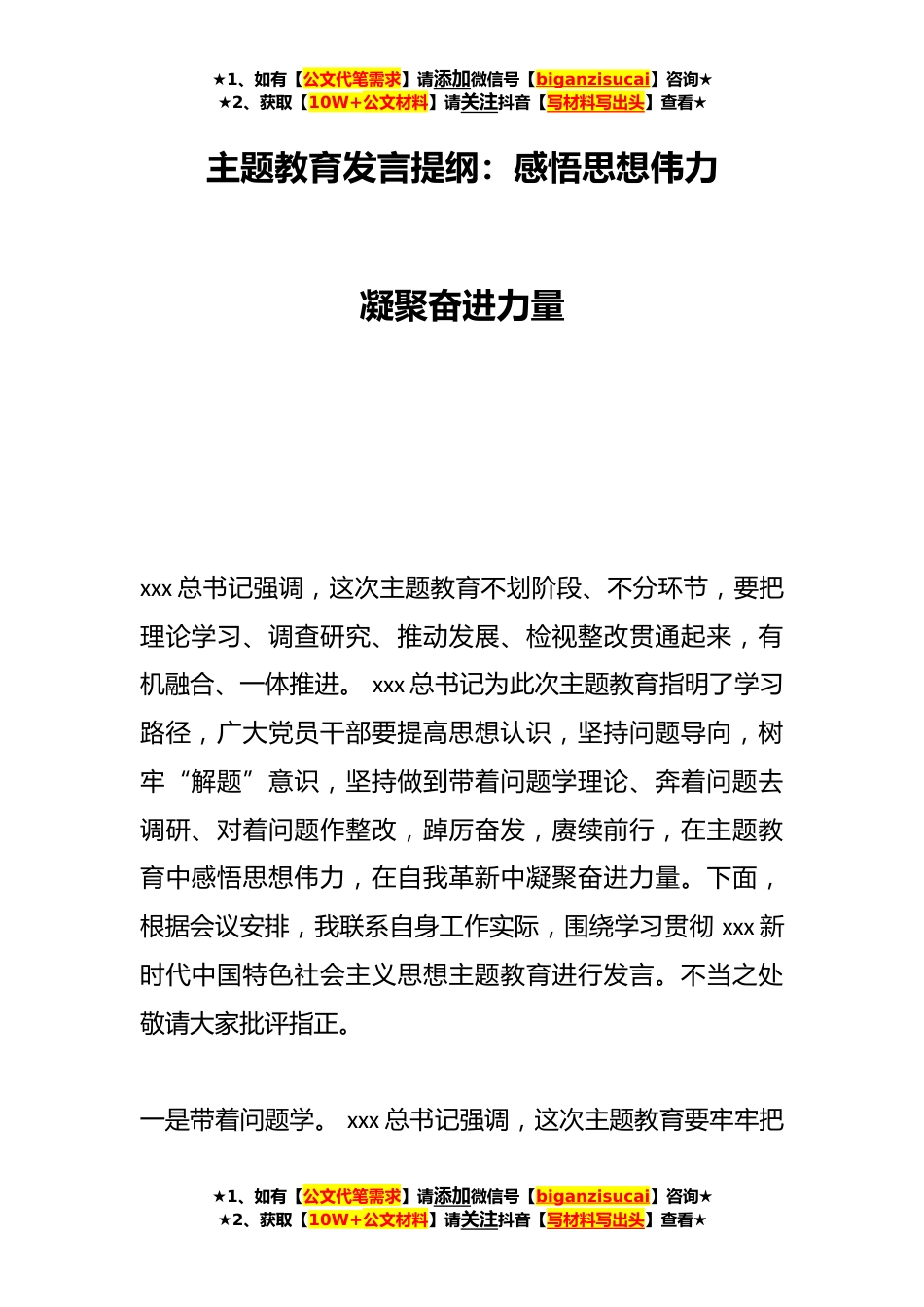 ★1、如有【公文代笔需求】请添加微信号【biganzisucai】咨询★★2、获取【10W+公文材料】请关注抖音【写材料写出头】查看★主题教育发言提纲:感悟思想伟力凝聚奋进力量xxx总书记强调,这次主题教育不划阶段、不分环节,要把理论学习、调查研究、推动发展、检视整改贯通起来,有机融合、一体推进。xxx总书记为此次主题教育指明了学习路径,广大党员干部要提高思想认识,坚持问题导向,树牢“解题”意识,坚持做到带着问题学理论、奔着问题去调研、对着问题作整改,踔厉奋发,赓续前行,在主题教育中感悟思想伟力,在自我革新中凝聚奋进力量。下面,根据会议安排,我联系自身工作实际,围绕学习贯彻xxx新时代中国特色社会主义思想主题教育进行发言。不当之处敬请大家批评指正。一是带着问题学。xxx总书记强调,这...