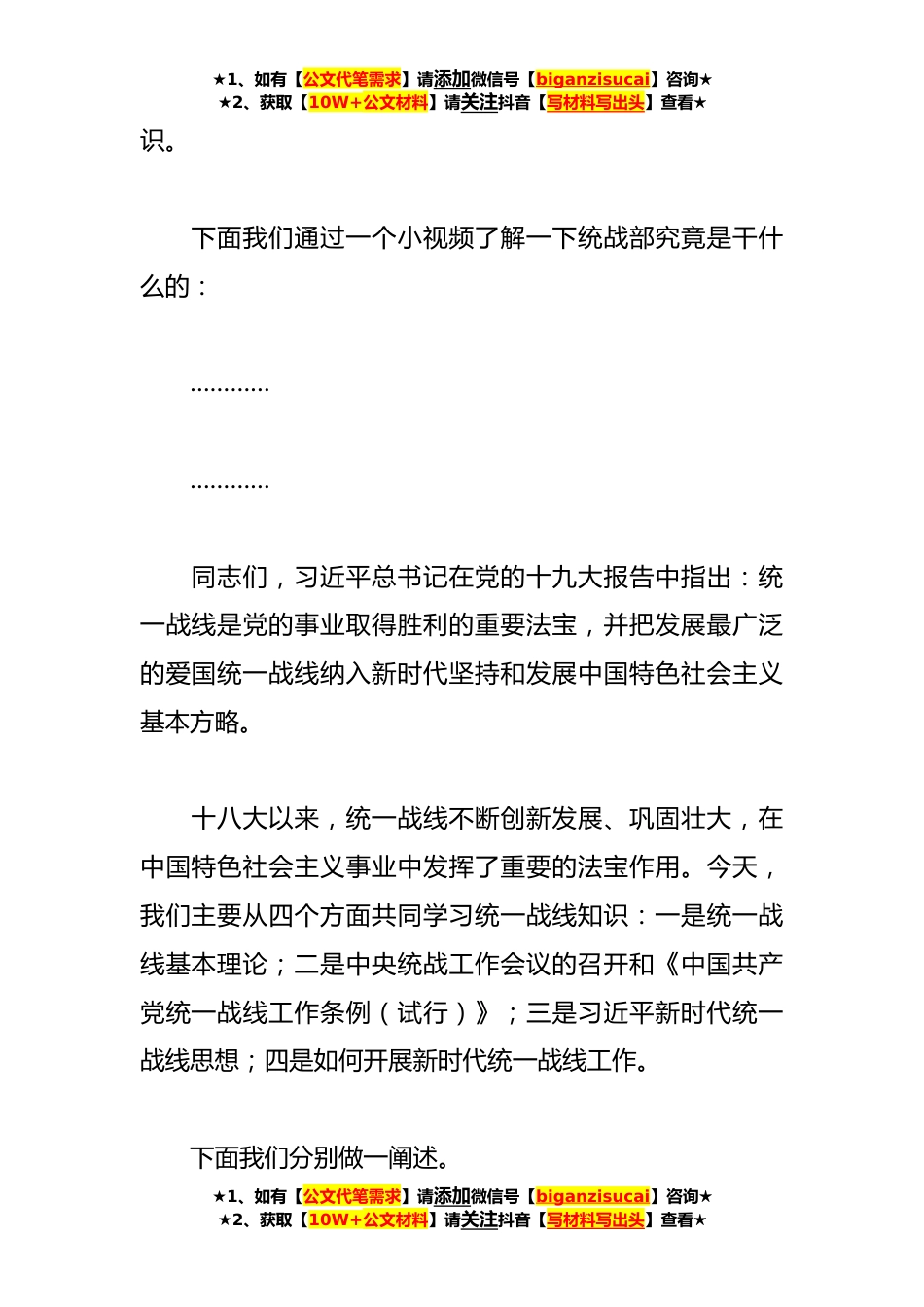 ★1、如有【公文代笔需求】请添加微信号【biganzisucai】咨询★★2、获取【10W+公文材料】请关注抖音【写材料写出头】查看★关于在主题教育中的党课讲稿同志们:回顾百年奋斗历程,我们党每逢重大历史关头,都用党的创新理论统一全党思想,每次党内集中教育都以思想教育、理论武装打头,从而使全党思想上更加统一、政治上更加成熟、事业上不断发展壮大。当前,党中央决定在全党深入开展学习贯彻习近平新时代中国特色社会主义思想主题教育,时机关键、意义重大、影响深远。习近平总书记在主题教育工作会议上的重要讲话,思想深邃、内涵丰富,为我们开展好主题教育提供了根本遵循。现在我结合统战工作与大家分享我的体会。提起统一战线,坊间曾流传“六自真言”:统战部门——自由自在统战工作——自娱自乐,统战干...