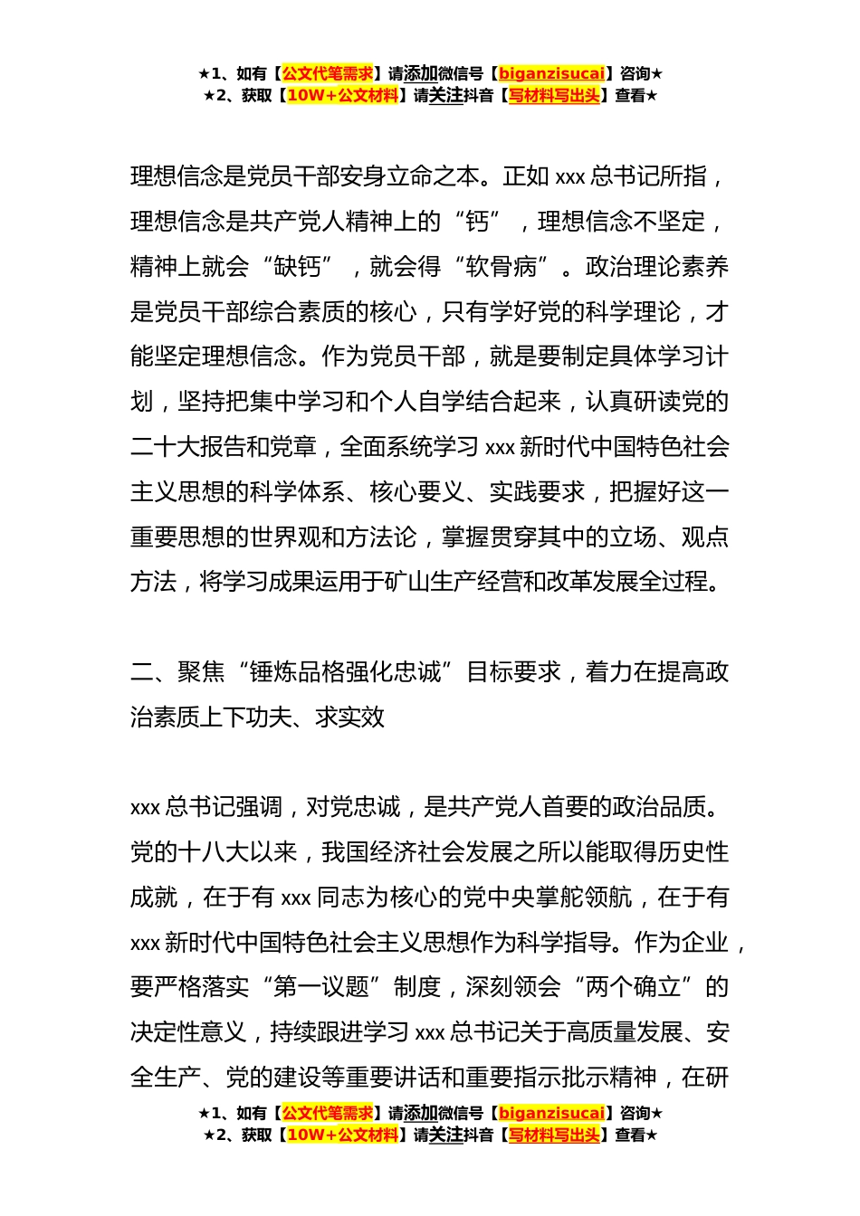★1、如有【公文代笔需求】请添加微信号【biganzisucai】咨询★★2、获取【10W+公文材料】请关注抖音【写材料写出头】查看★主题教育读书班上的交流发言:坚持五个聚焦推动主题教育走深走实深入开展学习贯彻xxx新时代中国特色社会主义思想主题教育,是党中央为全面贯彻党的二十大精神、统一全党思想解决党内存在突出问题,始终保持党同人民群众血肉联系推动党和国家事业发展所作的重*排部署。xxx总书记就这次主题教育,明确提出“凝心铸魂筑牢根本、锤炼品格强化忠诚、实干担当促进发展、践行宗旨为民造福、廉洁奉公树立新风”*方面的根本任务。公司紧扣主题教育学习材料,举办了为期一周的的读书班,主题鲜明、内容丰富,受益匪浅。下面,我围绕本次读书班学习内容,结合工作实际,简要谈几点体会,不妥之处,请批...