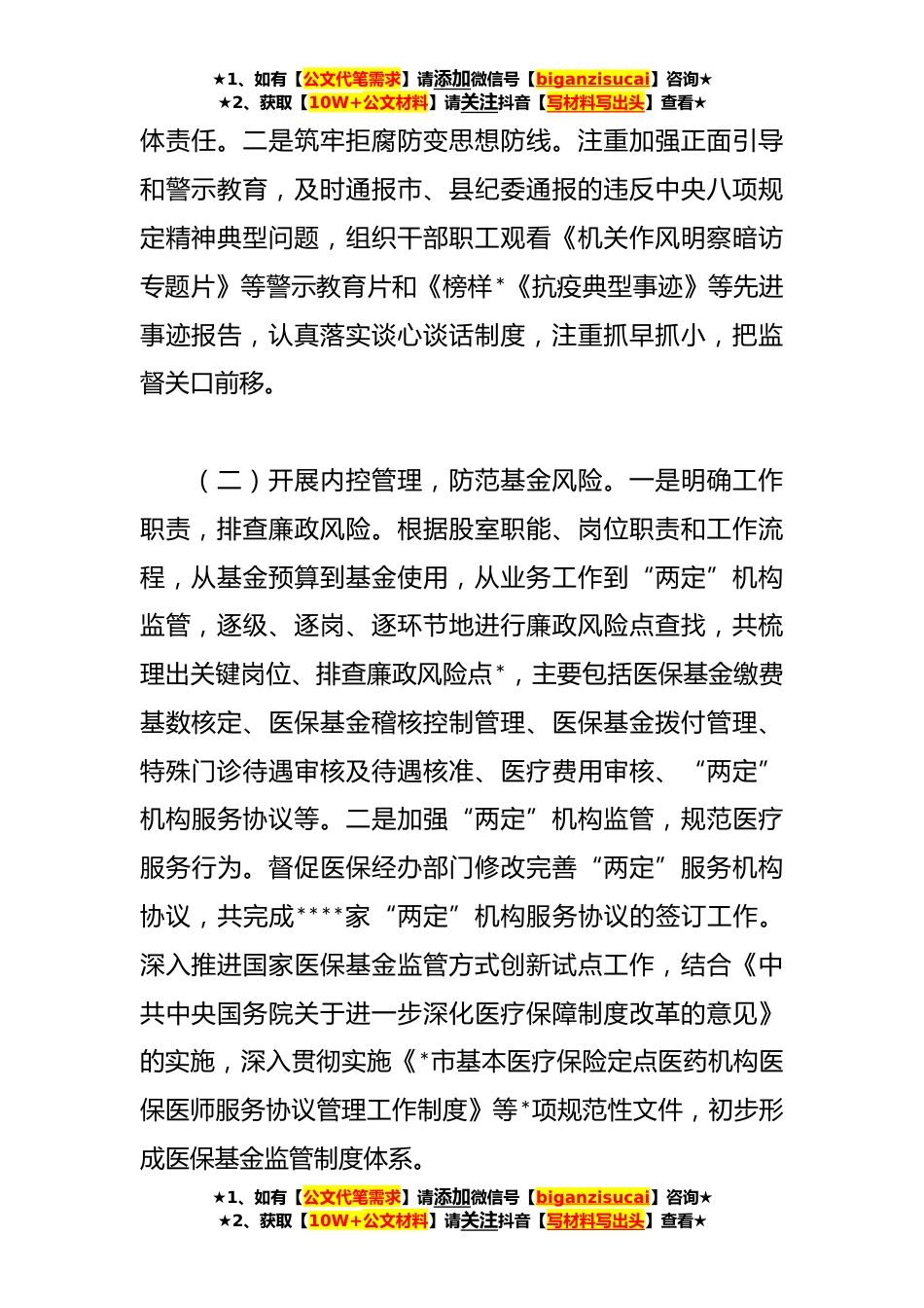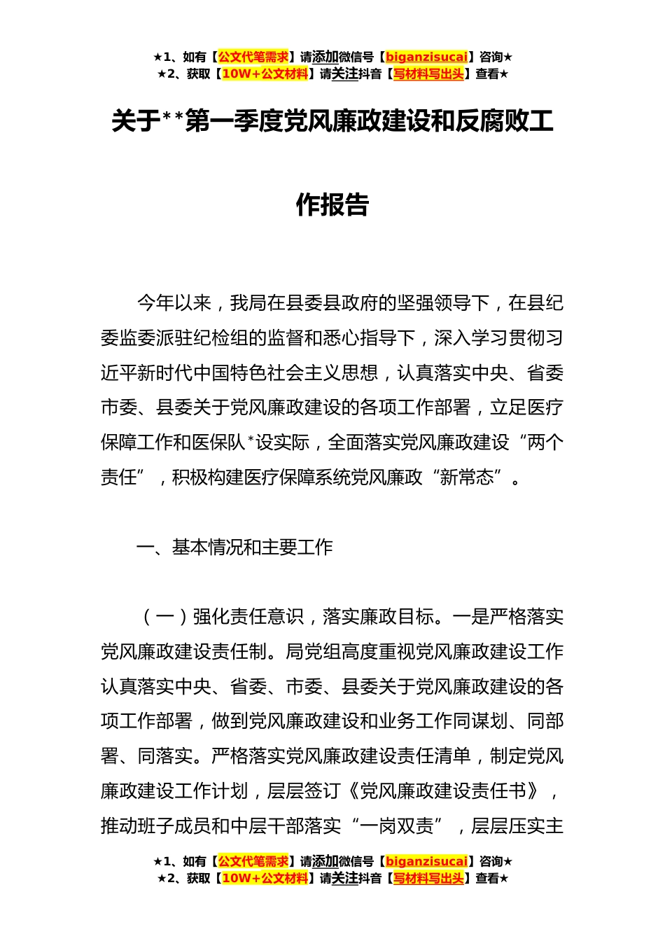 ★1、如有【公文代笔需求】请添加微信号【biganzisucai】咨询★★2、获取【10W+公文材料】请关注抖音【写材料写出头】查看★关于**第一季度党风廉政建设和反腐败工作报告今年以来,我局在县委县政府的坚强领导下,在县纪委监委派驻纪检组的监督和悉心指导下,深入学习贯彻习近平新时代中国特色社会主义思想,认真落实中央、省委市委、县委关于党风廉政建设的各项工作部署,立足医疗保障工作和医保队*设实际,全面落实党风廉政建设“两个责任”,积极构建医疗保障系统党风廉政“新常态”。一、基本情况和主要工作(一)强化责任意识,落实廉政目标。一是严格落实党风廉政建设责任制。局党组高度重视党风廉政建设工作认真落实中央、省委、市委、县委关于党风廉政建设的各项工作部署,做到党风廉政建设和业务工作同谋...