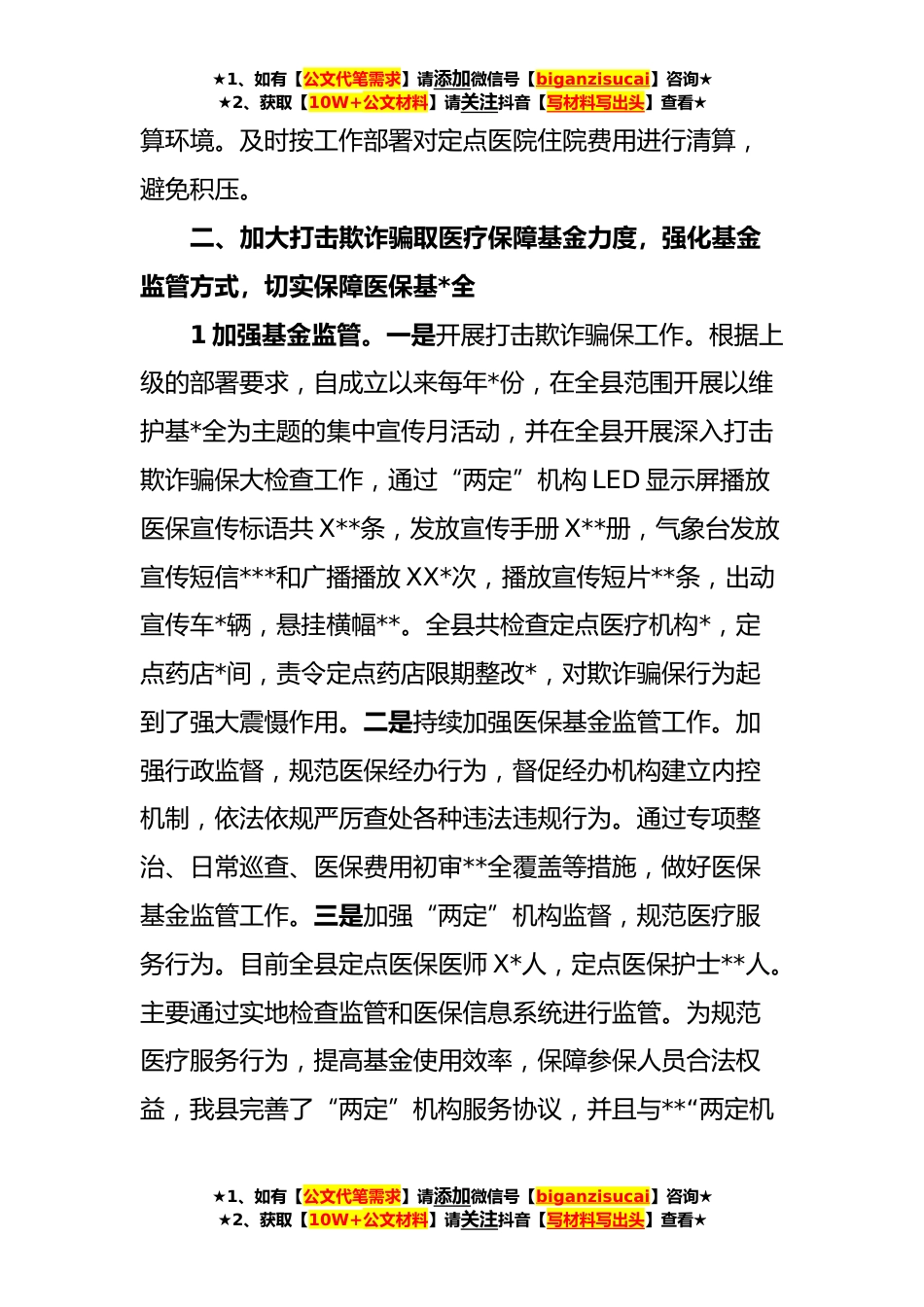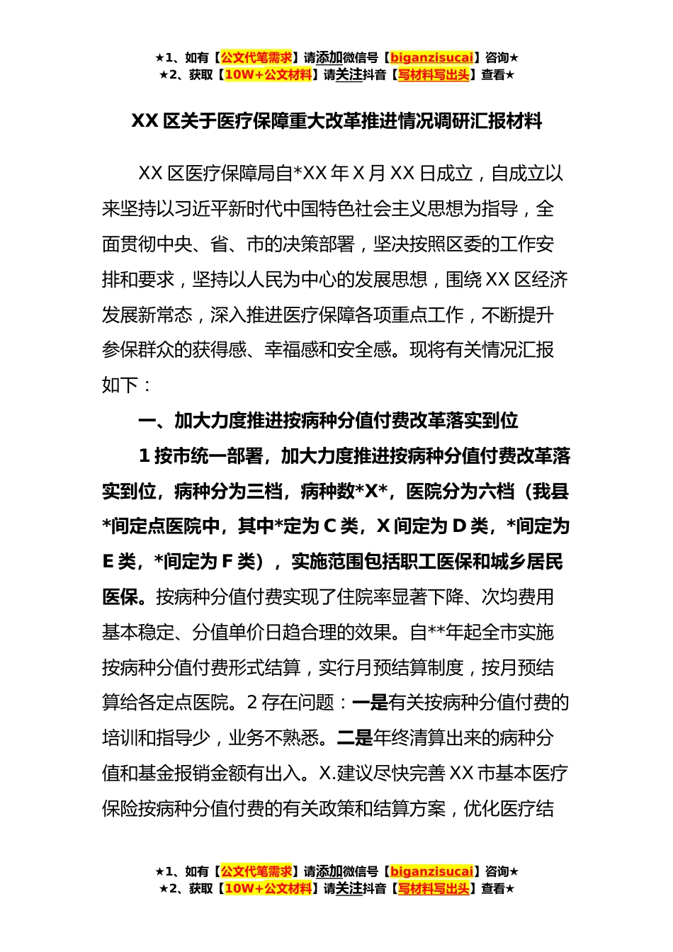 ★1、如有【公文代笔需求】请添加微信号【biganzisucai】咨询★★2、获取【10W+公文材料】请关注抖音【写材料写出头】查看★XX区关于医疗保障重大改革推进情况调研汇报材料XX区医疗保障局自*XX年X月XX日成立,自成立以来坚持以习近平新时代中国特色社会主义思想为指导,全面贯彻中央、省、市的决策部署,坚决按照区委的工作安排和要求,坚持以人民为中心的发展思想,围绕XX区经济发展新常态,深入推进医疗保障各项重点工作,不断提升参保群众的获得感、幸福感和安全感。现将有关情况汇报如下:一、加大力度推进按病种分值付费改革落实到位1按市统一部署,加大力度推进按病种分值付费改革落实到位,病种分为三档,病种数*X*,医院分为六档(我县*间定点医院中,其中*定为C类,X间定为D类,*间定为E类,*间定为F类)...