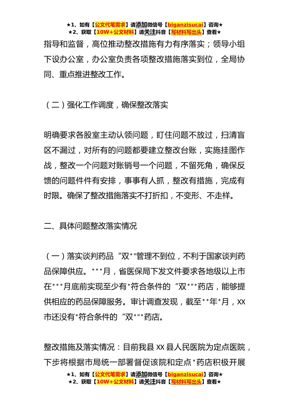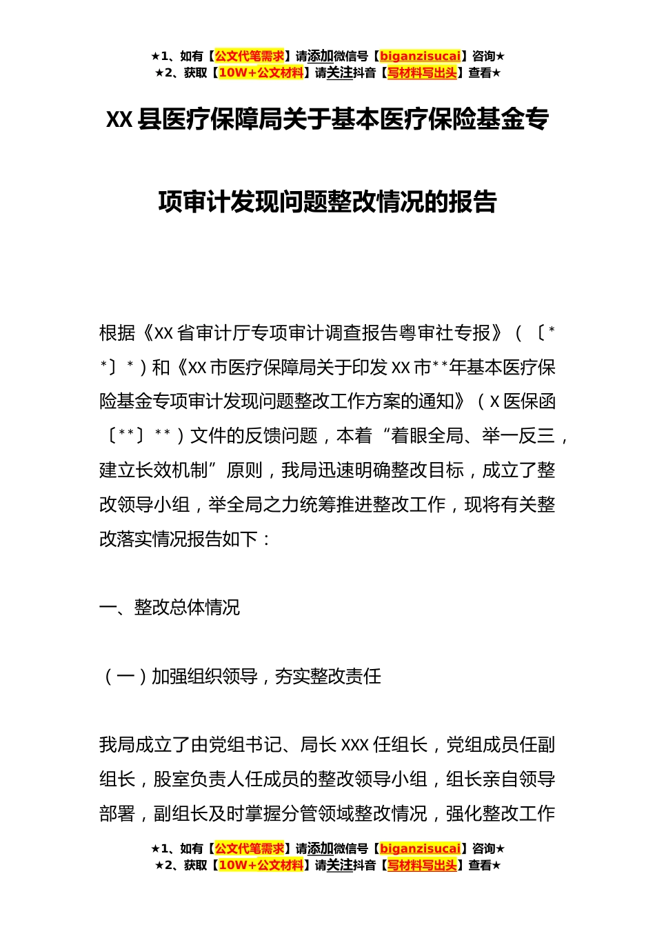 ★1、如有【公文代笔需求】请添加微信号【biganzisucai】咨询★★2、获取【10W+公文材料】请关注抖音【写材料写出头】查看★XX县医疗保障局关于基本医疗保险基金专项审计发现问题整改情况的报告根据《XX省审计厅专项审计调查报告粤审社专报》(〔**〕*)和《XX市医疗保障局关于印发XX市**年基本医疗保险基金专项审计发现问题整改工作方案的通知》(X医保函〔**〕**)文件的反馈问题,本着“着眼全局、举一反三,建立长效机制”原则,我局迅速明确整改目标,成立了整改领导小组,举全局之力统筹推进整改工作,现将有关整改落实情况报告如下:一、整改总体情况(一)加强组织领导,夯实整改责任我局成立了由党组书记、局长XXX任组长,党组成员任副组长,股室负责人任成员的整改领导小组,组长亲自领导部署,副组长及...