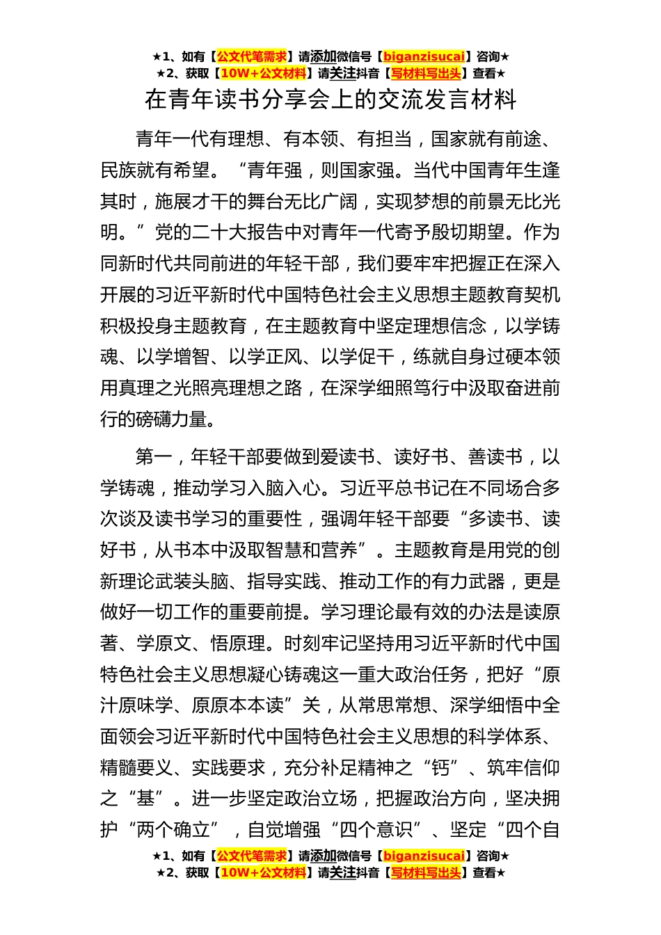 ★1、如有【公文代笔需求】请添加微信号【biganzisucai】咨询★★2、获取【10W+公文材料】请关注抖音【写材料写出头】查看★★1、如有【公文代笔需求】请添加微信号【biganzisucai】咨询★★2、获取【10W+公文材料】请关注抖音【写材料写出头】查看★★1、如有【公文代笔需求】请添加微信号【biganzisucai】咨询★★2、获取【10W+公文材料】请关注抖音【写材料写出头】查看★在青年读书分享会上的交流发言材料青年一代有理想、有本领、有担当,国家就有前途、民族就有希望。“青年强,则国家强。当代中国青年生逢其时,施展才干的舞台无比广阔,实现梦想的前景无比光明。”党的二十大报告中对青年一代寄予殷切期望。作为同新时代共同前进的年轻干部,我们要牢牢把握正在深入开展的习近平新时代中国特色社会主义思...