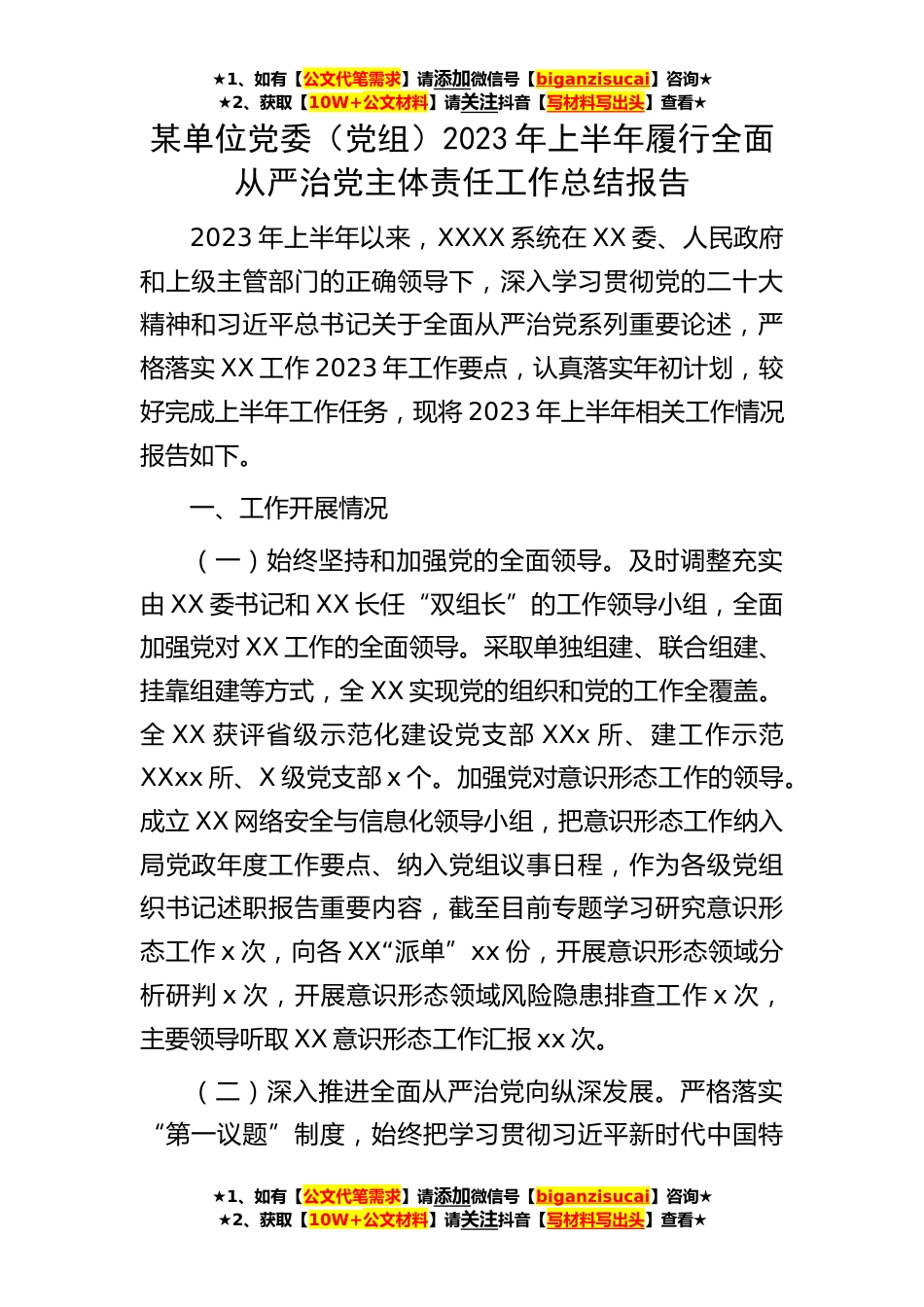 ★1、如有【公文代笔需求】请添加微信号【biganzisucai】咨询★★2、获取【10W+公文材料】请关注抖音【写材料写出头】查看★★1、如有【公文代笔需求】请添加微信号【biganzisucai】咨询★★2、获取【10W+公文材料】请关注抖音【写材料写出头】查看★★1、如有【公文代笔需求】请添加微信号【biganzisucai】咨询★★2、获取【10W+公文材料】请关注抖音【写材料写出头】查看★某单位党委(党组)2023年上半年履行全面从严治党主体责任工作总结报告2023年上半年以来,XXXX系统在XX委、人民政府和上级主管部门的正确领导下,深入学习贯彻党的二十大精神和习近平总书记关于全面从严治党系列重要论述,严格落实XX工作2023年工作要点,认真落实年初计划,较好完成上半年工作任务,现将2023年上半年相关工作情况报告如下...
