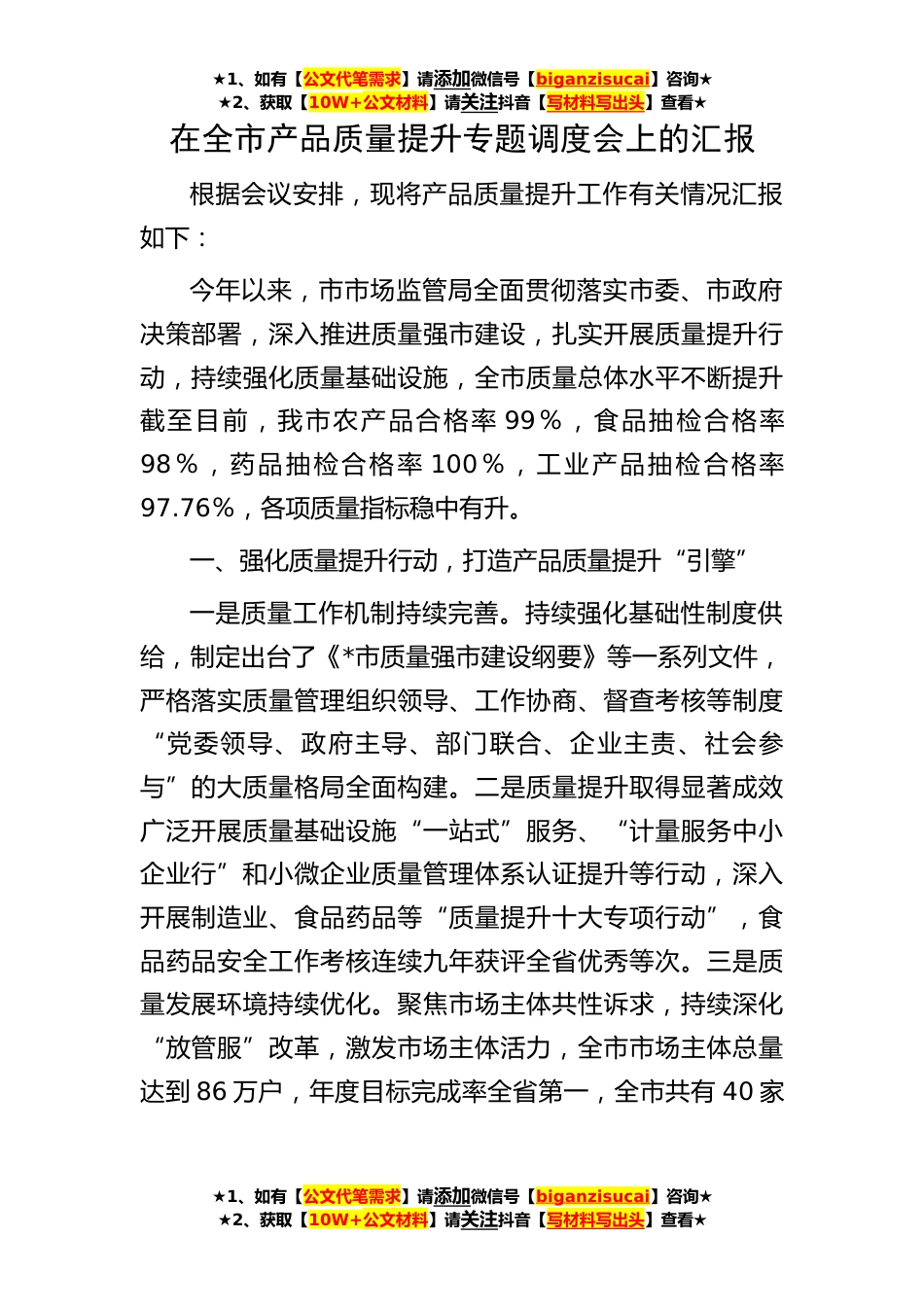 ★1、如有【公文代笔需求】请添加微信号【biganzisucai】咨询★★2、获取【10W+公文材料】请关注抖音【写材料写出头】查看★★1、如有【公文代笔需求】请添加微信号【biganzisucai】咨询★★2、获取【10W+公文材料】请关注抖音【写材料写出头】查看★★1、如有【公文代笔需求】请添加微信号【biganzisucai】咨询★★2、获取【10W+公文材料】请关注抖音【写材料写出头】查看★在全市产品质量提升专题调度会上的汇报根据会议安排,现将产品质量提升工作有关情况汇报如下:今年以来,市市场监管局全面贯彻落实市委、市政府决策部署,深入推进质量强市建设,扎实开展质量提升行动,持续强化质量基础设施,全市质量总体水平不断提升截至目前,我市农产品合格率99%,食品抽检合格率98%,药品抽检合格率100%,工业产品...