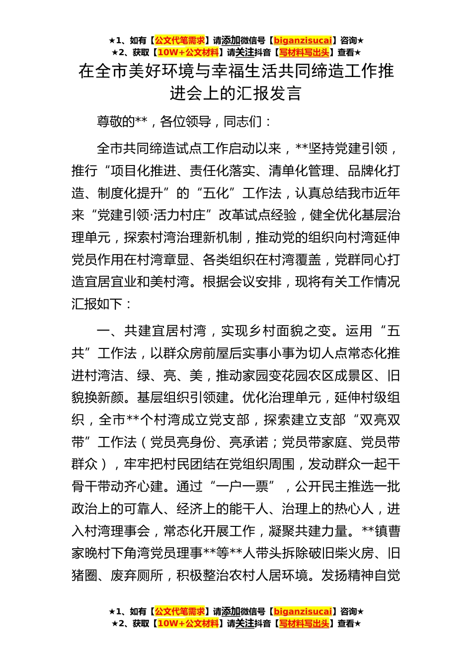 ★1、如有【公文代笔需求】请添加微信号【biganzisucai】咨询★★2、获取【10W+公文材料】请关注抖音【写材料写出头】查看★★1、如有【公文代笔需求】请添加微信号【biganzisucai】咨询★★2、获取【10W+公文材料】请关注抖音【写材料写出头】查看★★1、如有【公文代笔需求】请添加微信号【biganzisucai】咨询★★2、获取【10W+公文材料】请关注抖音【写材料写出头】查看★在全市美好环境与幸福生活共同缔造工作推进会上的汇报发言尊敬的**,各位领导,同志们:全市共同缔造试点工作启动以来,**坚持党建引领,推行“项目化推进、责任化落实、清单化管理、品牌化打造、制度化提升”的“五化”工作法,认真总结我市近年来“党建引领·活力村庄”改革试点经验,健全优化基层治理单元,探索村湾治理新机制,推动党...