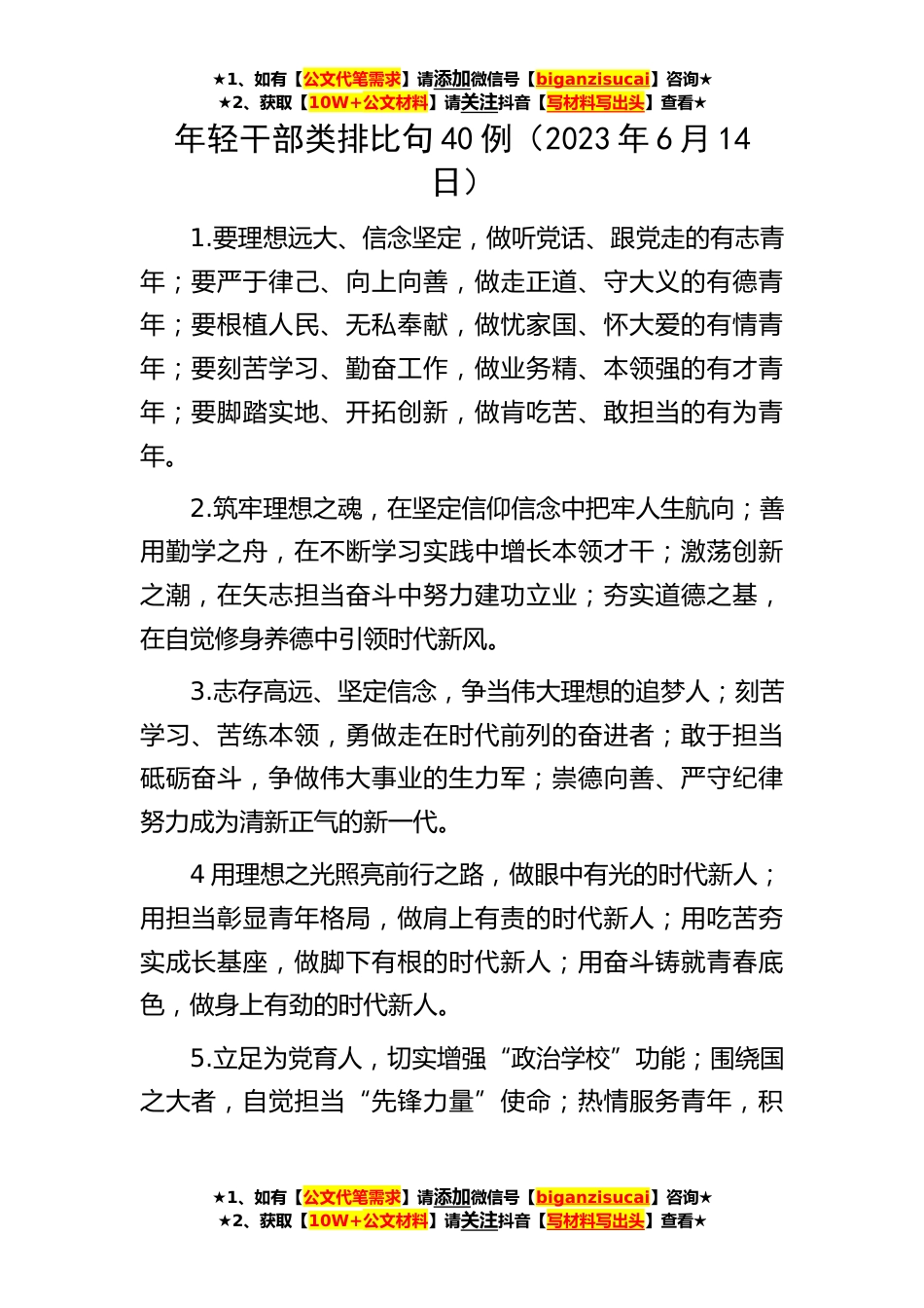 ★1、如有【公文代笔需求】请添加微信号【biganzisucai】咨询★★2、获取【10W+公文材料】请关注抖音【写材料写出头】查看★★1、如有【公文代笔需求】请添加微信号【biganzisucai】咨询★★2、获取【10W+公文材料】请关注抖音【写材料写出头】查看★★1、如有【公文代笔需求】请添加微信号【biganzisucai】咨询★★2、获取【10W+公文材料】请关注抖音【写材料写出头】查看★年轻干部类排比句40例(2023年6月14日)1.要理想远大、信念坚定,做听党话、跟党走的有志青年;要严于律己、向上向善,做走正道、守大义的有德青年;要根植人民、无私奉献,做忧家国、怀大爱的有情青年;要刻苦学习、勤奋工作,做业务精、本领强的有才青年;要脚踏实地、开拓创新,做肯吃苦、敢担当的有为青年。2.筑牢理想之魂,在坚定信仰...