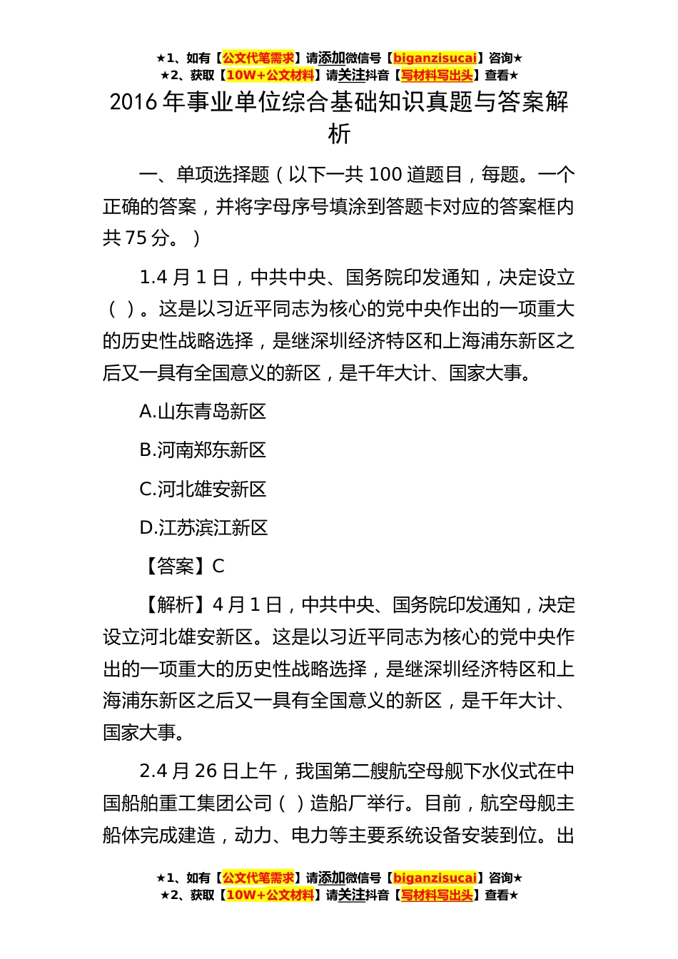 ★1、如有【公文代笔需求】请添加微信号【biganzisucai】咨询★★2、获取【10W+公文材料】请关注抖音【写材料写出头】查看★★1、如有【公文代笔需求】请添加微信号【biganzisucai】咨询★★2、获取【10W+公文材料】请关注抖音【写材料写出头】查看★★1、如有【公文代笔需求】请添加微信号【biganzisucai】咨询★★2、获取【10W+公文材料】请关注抖音【写材料写出头】查看★2016年事业单位综合基础知识真题与答案解析一、单项选择题(以下一共100道题目,每题。一个正确的答案,并将字母序号填涂到答题卡对应的答案框内共75分。)1.4月1日,中共中央、国务院印发通知,决定设立()。这是以习近平同志为核心的党中央作出的一项重大的历史性战略选择,是继深圳经济特区和上海浦东新区之后又一具有全国意义的新区,...