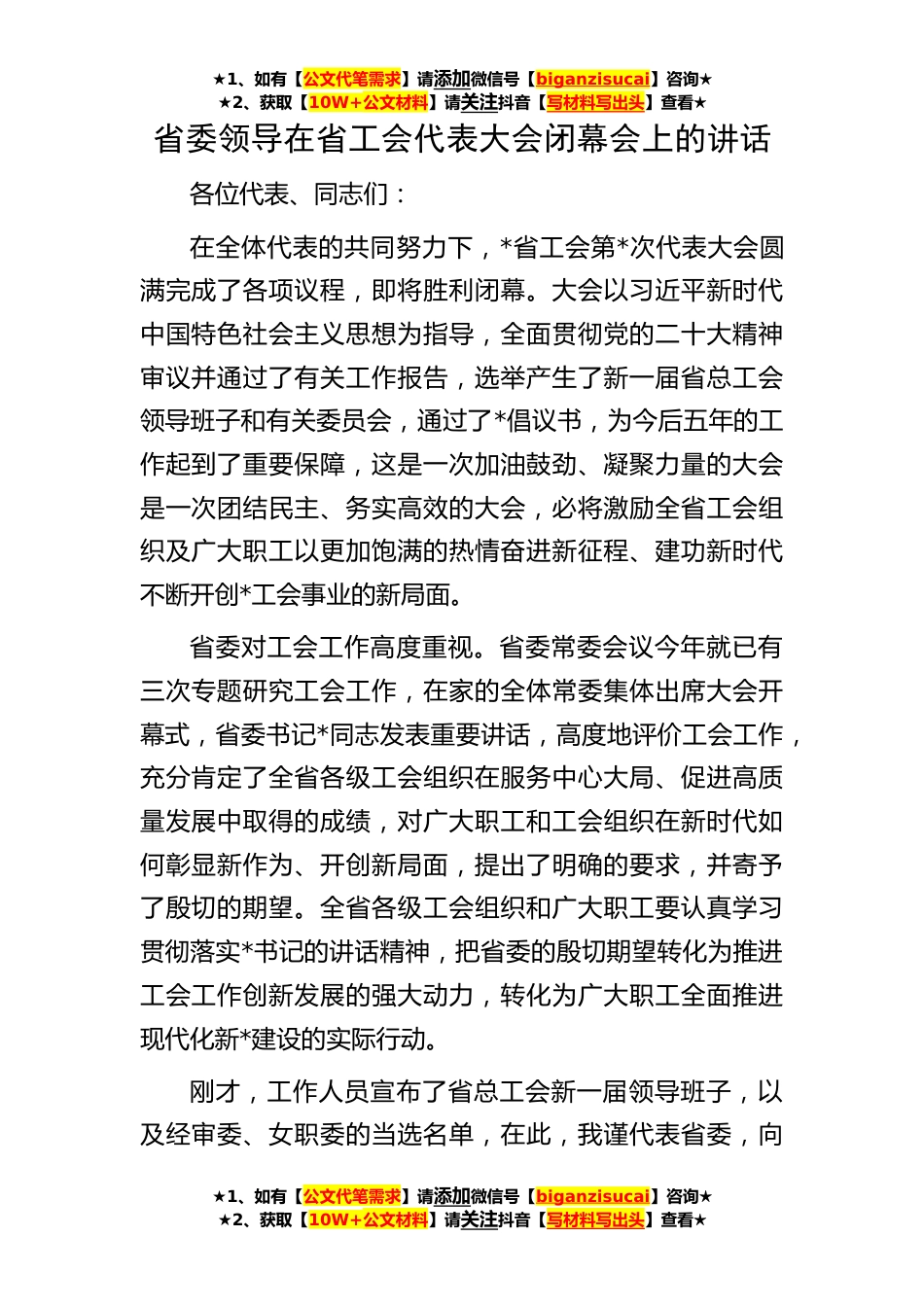 ★1、如有【公文代笔需求】请添加微信号【biganzisucai】咨询★★2、获取【10W+公文材料】请关注抖音【写材料写出头】查看★★1、如有【公文代笔需求】请添加微信号【biganzisucai】咨询★★2、获取【10W+公文材料】请关注抖音【写材料写出头】查看★★1、如有【公文代笔需求】请添加微信号【biganzisucai】咨询★★2、获取【10W+公文材料】请关注抖音【写材料写出头】查看★省委领导在省工会代表大会闭幕会上的讲话各位代表、同志们:在全体代表的共同努力下,*省工会第*次代表大会圆满完成了各项议程,即将胜利闭幕。大会以习近平新时代中国特色社会主义思想为指导,全面贯彻党的二十大精神审议并通过了有关工作报告,选举产生了新一届省总工会领导班子和有关委员会,通过了*倡议书,为今后五年的工作起到了重要...