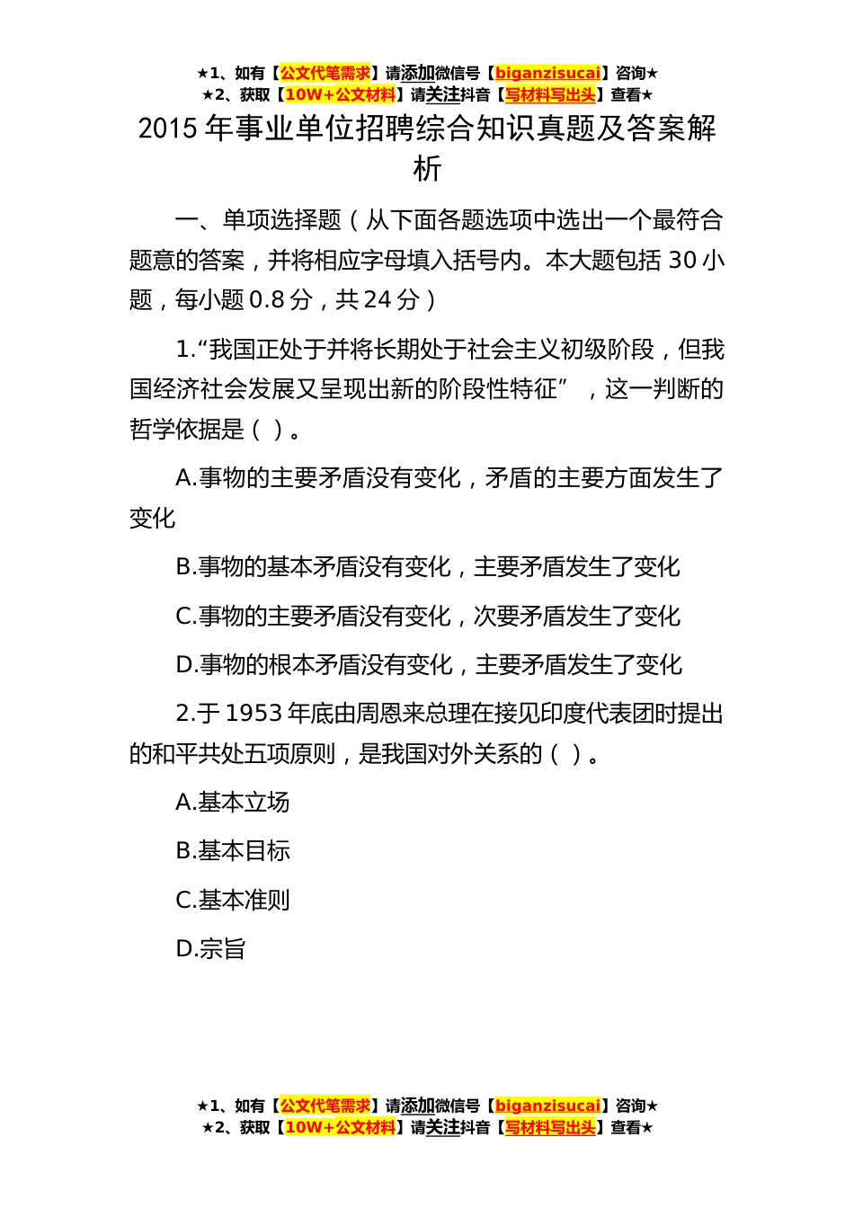 ★1、如有【公文代笔需求】请添加微信号【biganzisucai】咨询★★2、获取【10W+公文材料】请关注抖音【写材料写出头】查看★★1、如有【公文代笔需求】请添加微信号【biganzisucai】咨询★★2、获取【10W+公文材料】请关注抖音【写材料写出头】查看★★1、如有【公文代笔需求】请添加微信号【biganzisucai】咨询★★2、获取【10W+公文材料】请关注抖音【写材料写出头】查看★2015年事业单位招聘综合知识真题及答案解析一、单项选择题(从下面各题选项中选出一个最符合题意的答案,并将相应字母填入括号内。本大题包括30小题,每小题0.8分,共24分)1.“我国正处于并将长期处于社会主义初级阶段,但我国经济社会发展又呈现出新的阶段性特征”,这一判断的哲学依据是()。A.事物的主要矛盾没有变化,矛盾的主要方面...