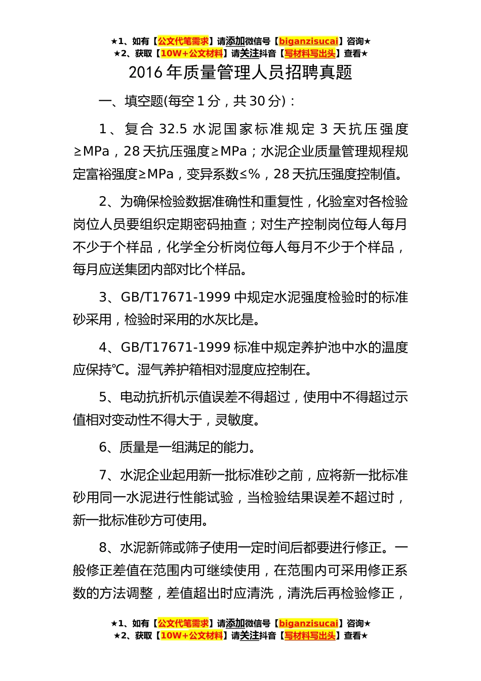 ★1、如有【公文代笔需求】请添加微信号【biganzisucai】咨询★★2、获取【10W+公文材料】请关注抖音【写材料写出头】查看★★1、如有【公文代笔需求】请添加微信号【biganzisucai】咨询★★2、获取【10W+公文材料】请关注抖音【写材料写出头】查看★★1、如有【公文代笔需求】请添加微信号【biganzisucai】咨询★★2、获取【10W+公文材料】请关注抖音【写材料写出头】查看★2016年质量管理人员招聘真题一、填空题(每空1分,共30分):1、复合32.5水泥国家标准规定3天抗压强度≥MPa,28天抗压强度≥MPa;水泥企业质量管理规程规定富裕强度≥MPa,变异系数≤%,28天抗压强度控制值。2、为确保检验数据准确性和重复性,化验室对各检验岗位人员要组织定期密码抽查;对生产控制岗位每人每月不少于个样品,化学全分析岗...