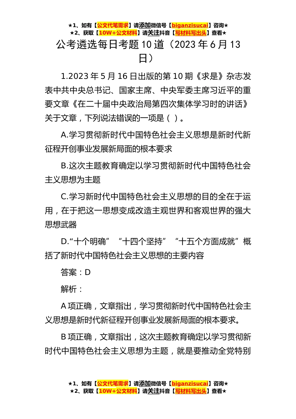 ★1、如有【公文代笔需求】请添加微信号【biganzisucai】咨询★★2、获取【10W+公文材料】请关注抖音【写材料写出头】查看★★1、如有【公文代笔需求】请添加微信号【biganzisucai】咨询★★2、获取【10W+公文材料】请关注抖音【写材料写出头】查看★★1、如有【公文代笔需求】请添加微信号【biganzisucai】咨询★★2、获取【10W+公文材料】请关注抖音【写材料写出头】查看★公考遴选每日考题10道(2023年6月13日)1.2023年5月16日出版的第10期《求是》杂志发表中共中央总书记、国家主席、中央军委主席习近平的重要文章《在二十届中央政治局第四次集体学习时的讲话》关于文章,下列说法错误的一项是()。A.学习贯彻新时代中国特色社会主义思想是新时代新征程开创事业发展新局面的根本要求B.这次主题教育确定以学...