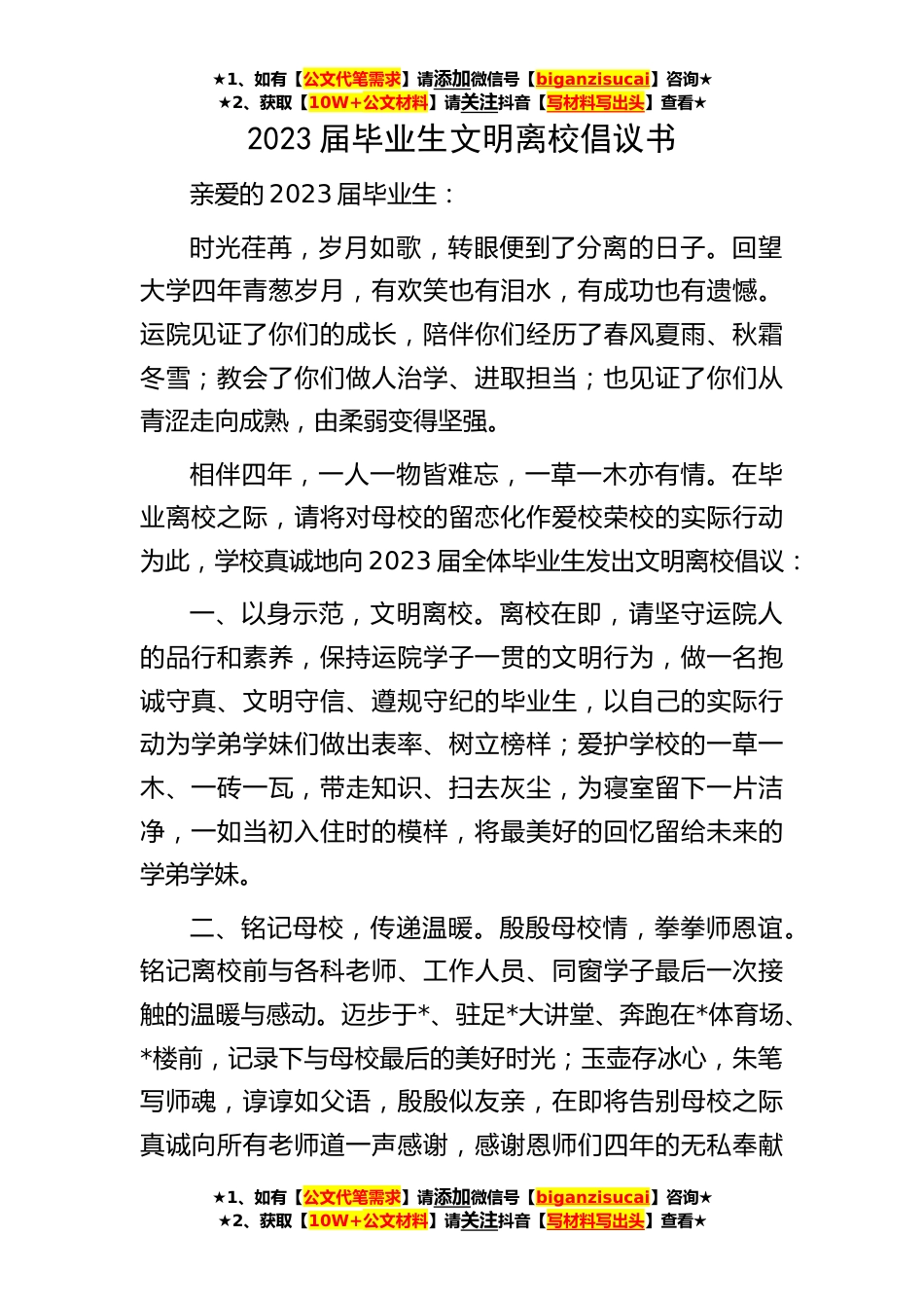 ★1、如有【公文代笔需求】请添加微信号【biganzisucai】咨询★★2、获取【10W+公文材料】请关注抖音【写材料写出头】查看★★1、如有【公文代笔需求】请添加微信号【biganzisucai】咨询★★2、获取【10W+公文材料】请关注抖音【写材料写出头】查看★★1、如有【公文代笔需求】请添加微信号【biganzisucai】咨询★★2、获取【10W+公文材料】请关注抖音【写材料写出头】查看★2023届毕业生文明离校倡议书亲爱的2023届毕业生:时光荏苒,岁月如歌,转眼便到了分离的日子。回望大学四年青葱岁月,有欢笑也有泪水,有成功也有遗憾。运院见证了你们的成长,陪伴你们经历了春风夏雨、秋霜冬雪;教会了你们做人治学、进取担当;也见证了你们从青涩走向成熟,由柔弱变得坚强。相伴四年,一人一物皆难忘,一草一木亦有情。...