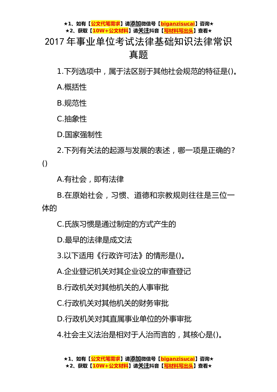 ★1、如有【公文代笔需求】请添加微信号【biganzisucai】咨询★★2、获取【10W+公文材料】请关注抖音【写材料写出头】查看★★1、如有【公文代笔需求】请添加微信号【biganzisucai】咨询★★2、获取【10W+公文材料】请关注抖音【写材料写出头】查看★★1、如有【公文代笔需求】请添加微信号【biganzisucai】咨询★★2、获取【10W+公文材料】请关注抖音【写材料写出头】查看★2017年事业单位考试法律基础知识法律常识真题1.下列选项中,属于法区别于其他社会规范的特征是()。A.概括性B.规范性C.抽象性D.国家强制性2.下列有关法的起源与发展的表述,哪一项是正确的?()A.有社会,即有法律B.在原始社会,习惯、道德和宗教规则往往是三位一体的C.氏族习惯是通过制定的方式产生的D.最早的法律是成文法3.以下适用《行政许...