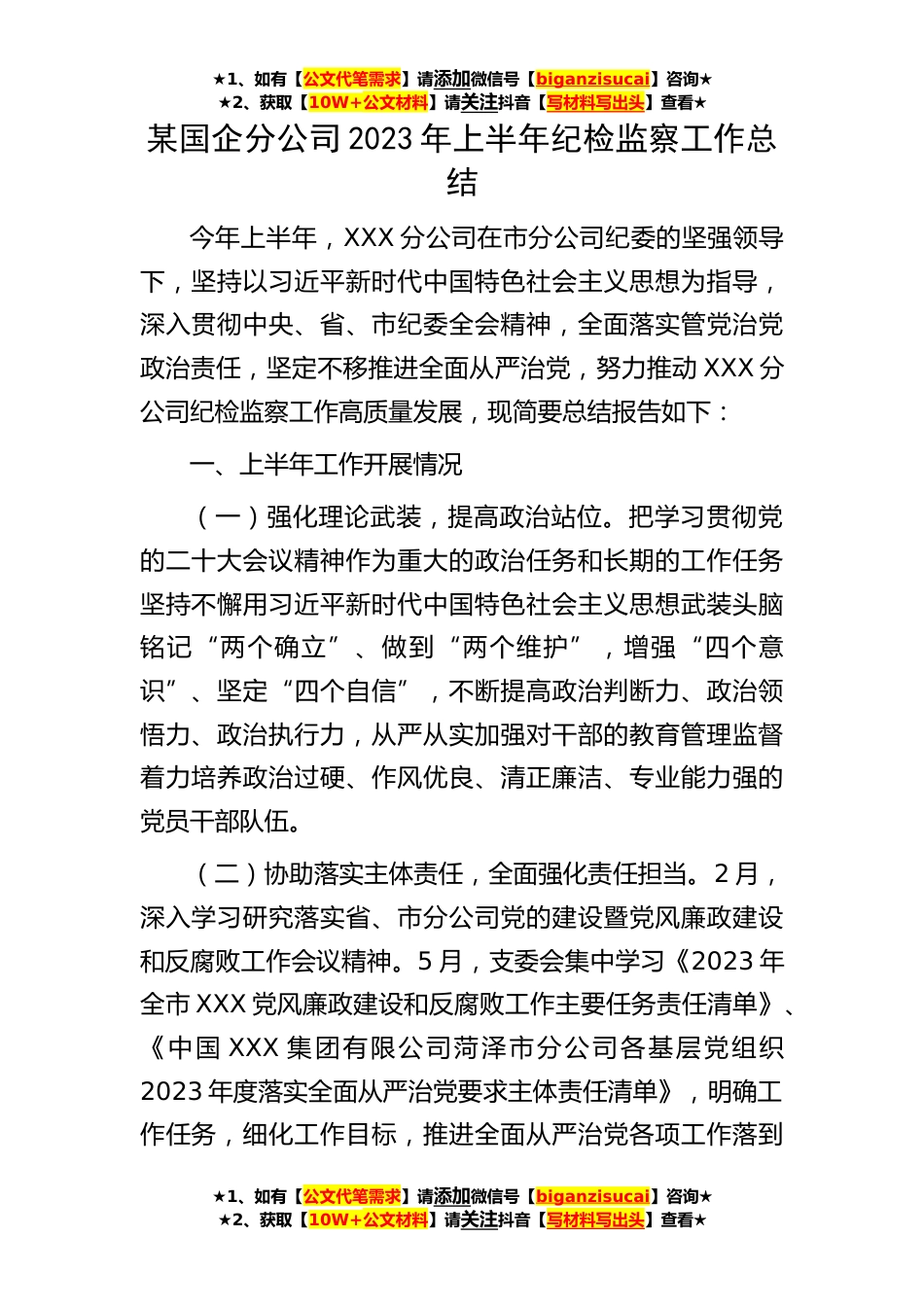 ★1、如有【公文代笔需求】请添加微信号【biganzisucai】咨询★★2、获取【10W+公文材料】请关注抖音【写材料写出头】查看★★1、如有【公文代笔需求】请添加微信号【biganzisucai】咨询★★2、获取【10W+公文材料】请关注抖音【写材料写出头】查看★★1、如有【公文代笔需求】请添加微信号【biganzisucai】咨询★★2、获取【10W+公文材料】请关注抖音【写材料写出头】查看★某国企分公司2023年上半年纪检监察工作总结今年上半年,XXX分公司在市分公司纪委的坚强领导下,坚持以习近平新时代中国特色社会主义思想为指导,深入贯彻中央、省、市纪委全会精神,全面落实管党治党政治责任,坚定不移推进全面从严治党,努力推动XXX分公司纪检监察工作高质量发展,现简要总结报告如下:一、上半年工作开展情况(一)强化...