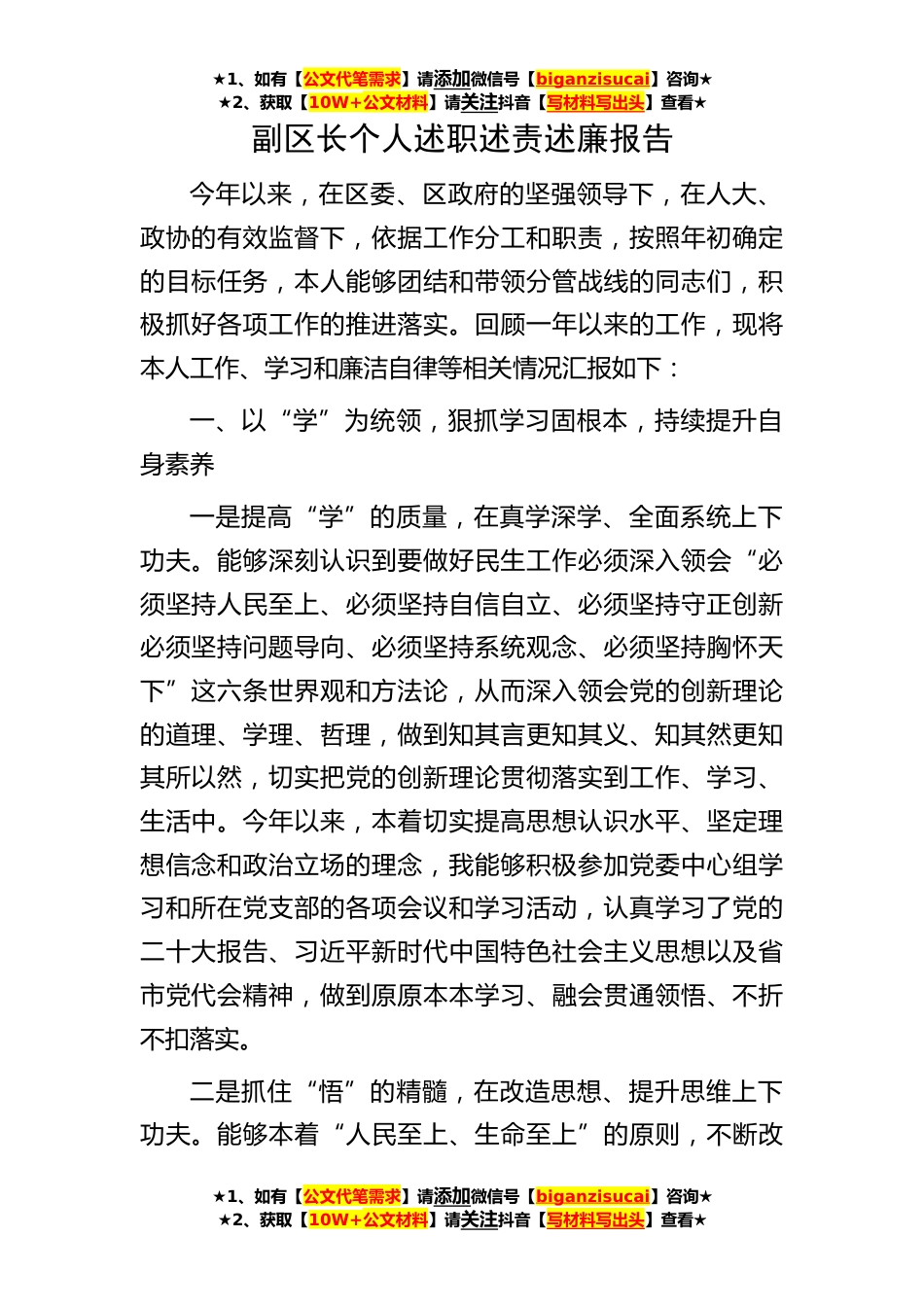 ★1、如有【公文代笔需求】请添加微信号【biganzisucai】咨询★★2、获取【10W+公文材料】请关注抖音【写材料写出头】查看★★1、如有【公文代笔需求】请添加微信号【biganzisucai】咨询★★2、获取【10W+公文材料】请关注抖音【写材料写出头】查看★★1、如有【公文代笔需求】请添加微信号【biganzisucai】咨询★★2、获取【10W+公文材料】请关注抖音【写材料写出头】查看★副区长个人述职述责述廉报告今年以来,在区委、区政府的坚强领导下,在人大、政协的有效监督下,依据工作分工和职责,按照年初确定的目标任务,本人能够团结和带领分管战线的同志们,积极抓好各项工作的推进落实。回顾一年以来的工作,现将本人工作、学习和廉洁自律等相关情况汇报如下:一、以“学”为统领,狠抓学习固根本,持续提升自身...