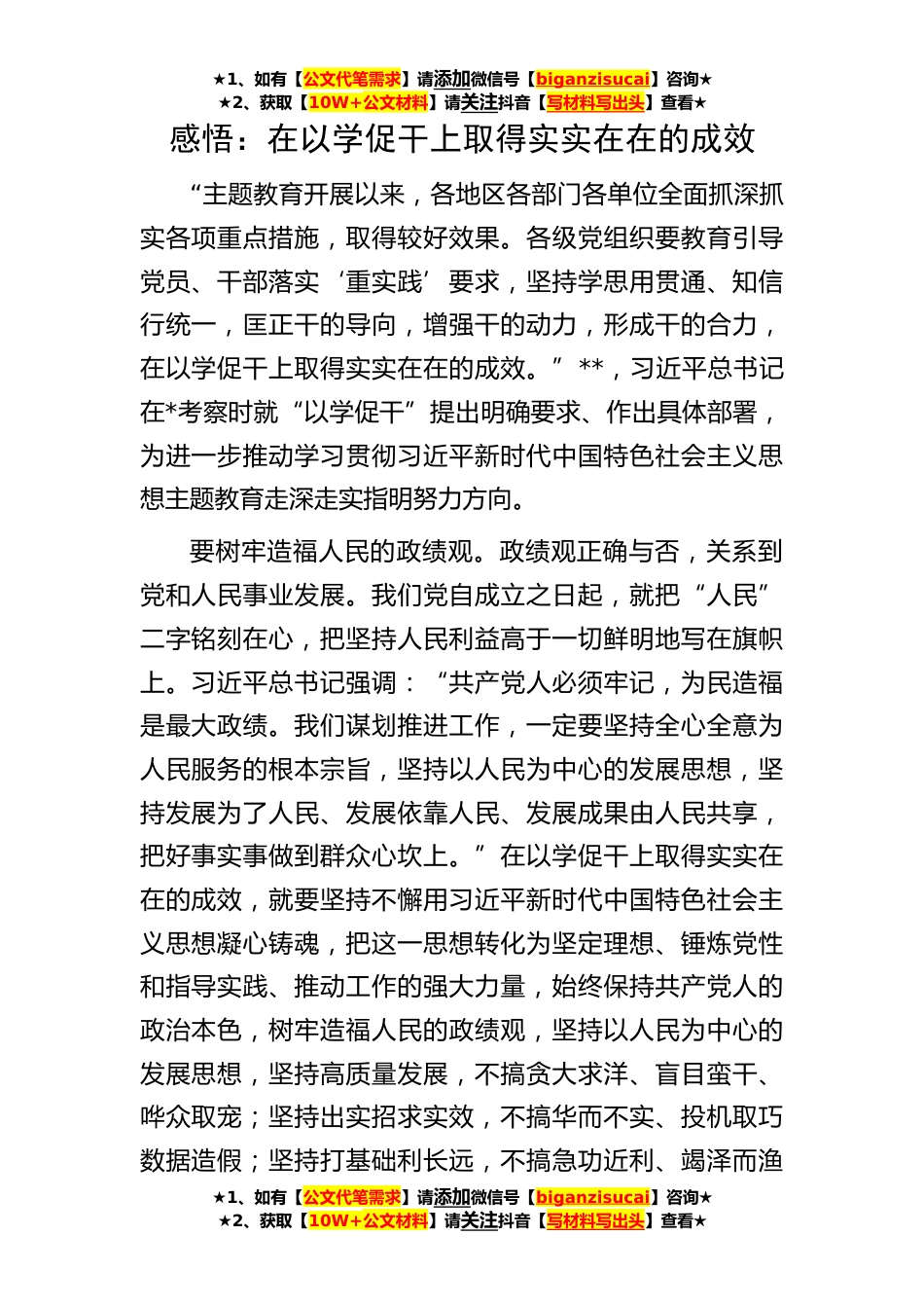 ★1、如有【公文代笔需求】请添加微信号【biganzisucai】咨询★★2、获取【10W+公文材料】请关注抖音【写材料写出头】查看★★1、如有【公文代笔需求】请添加微信号【biganzisucai】咨询★★2、获取【10W+公文材料】请关注抖音【写材料写出头】查看★★1、如有【公文代笔需求】请添加微信号【biganzisucai】咨询★★2、获取【10W+公文材料】请关注抖音【写材料写出头】查看★感悟:在以学促干上取得实实在在的成效“主题教育开展以来,各地区各部门各单位全面抓深抓实各项重点措施,取得较好效果。各级党组织要教育引导党员、干部落实‘重实践’要求,坚持学思用贯通、知信行统一,匡正干的导向,增强干的动力,形成干的合力,在以学促干上取得实实在在的成效。”**,习近平总书记在*考察时就“以学促干”提出明确...