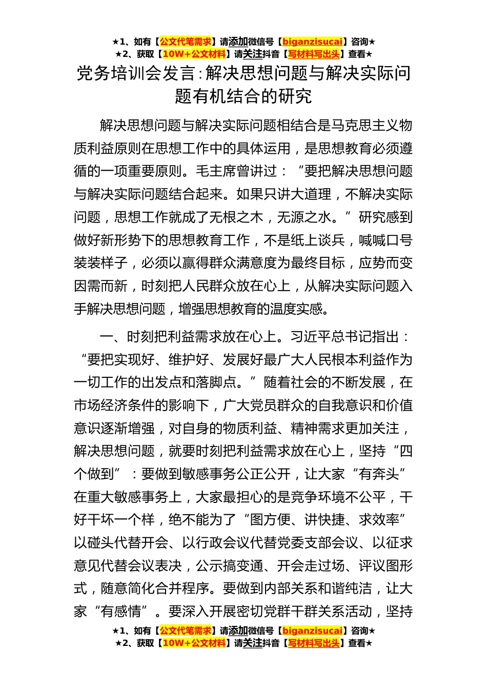 ★1、如有【公文代笔需求】请添加微信号【biganzisucai】咨询★★2、获取【10W+公文材料】请关注抖音【写材料写出头】查看★★1、如有【公文代笔需求】请添加微信号【biganzisucai】咨询★★2、获取【10W+公文材料】请关注抖音【写材料写出头】查看★★1、如有【公文代笔需求】请添加微信号【biganzisucai】咨询★★2、获取【10W+公文材料】请关注抖音【写材料写出头】查看★党务培训会发言:解决思想问题与解决实际问题有机结合的研究解决思想问题与解决实际问题相结合是马克思主义物质利益原则在思想工作中的具体运用,是思想教育必须遵循的一项重要原则。毛主席曾讲过:“要把解决思想问题与解决实际问题结合起来。如果只讲大道理,不解决实际问题,思想工作就成了无根之木,无源之水。”研究感到做好新形势下的...