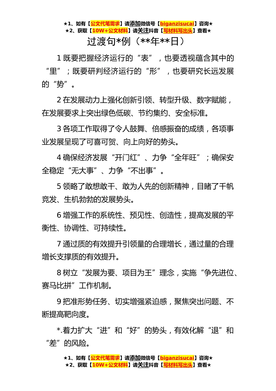 ★1、如有【公文代笔需求】请添加微信号【biganzisucai】咨询★★2、获取【10W+公文材料】请关注抖音【写材料写出头】查看★★1、如有【公文代笔需求】请添加微信号【biganzisucai】咨询★★2、获取【10W+公文材料】请关注抖音【写材料写出头】查看★★1、如有【公文代笔需求】请添加微信号【biganzisucai】咨询★★2、获取【10W+公文材料】请关注抖音【写材料写出头】查看★过渡句*例(**年**日)1既要把握经济运行的“表”,也要透视蕴含其中的“里”;既要研判经济运行的“形”,也要研究长远发展的“势”。2在发展动力上强化创新引领、转型升级、数字赋能,在发展要求上突出绿色低碳、节约集约、安全标准。3各项工作取得了令人鼓舞、倍感振奋的成绩,各项事业发展呈现了可喜可贺、向上向好的势头。4确保经济发...