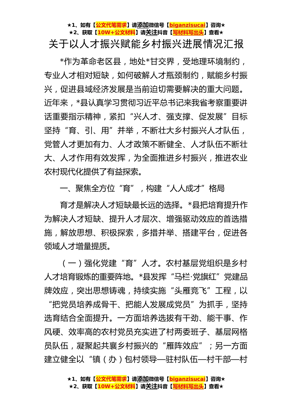 ★1、如有【公文代笔需求】请添加微信号【biganzisucai】咨询★★2、获取【10W+公文材料】请关注抖音【写材料写出头】查看★★1、如有【公文代笔需求】请添加微信号【biganzisucai】咨询★★2、获取【10W+公文材料】请关注抖音【写材料写出头】查看★★1、如有【公文代笔需求】请添加微信号【biganzisucai】咨询★★2、获取【10W+公文材料】请关注抖音【写材料写出头】查看★关于以人才振兴赋能乡村振兴进展情况汇报*作为革命老区县,地处*甘交界,受地理环境制约,专业人才相对短缺,如何破解人才瓶颈制约,赋能乡村振兴,促进县域经济发展是当前迫切需要解决的重大问题。近年来,*县认真学习贯彻习近平总书记来我省考察重要讲话重要指示精神,紧扣“兴人才、强支撑、促发展”目标坚持“育、引、用”并举,不断壮...