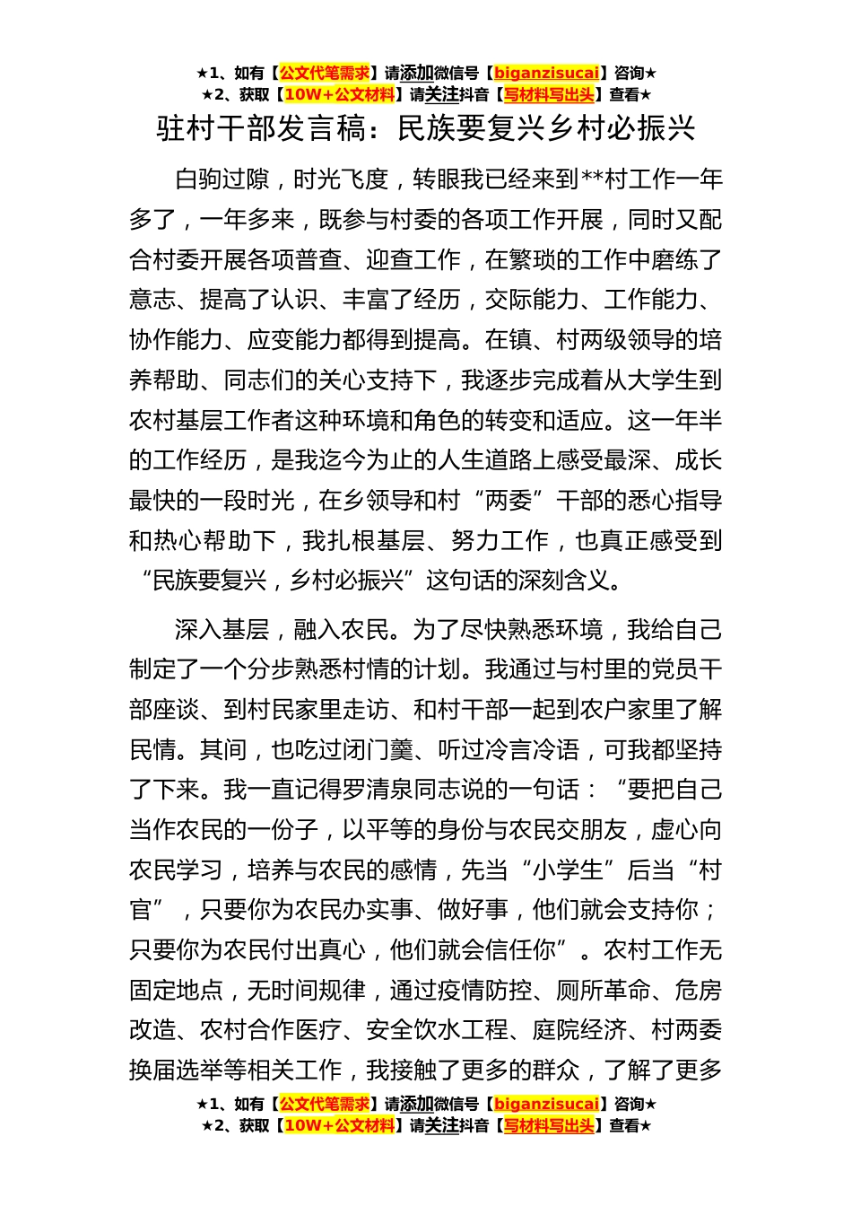 ★1、如有【公文代笔需求】请添加微信号【biganzisucai】咨询★★2、获取【10W+公文材料】请关注抖音【写材料写出头】查看★★1、如有【公文代笔需求】请添加微信号【biganzisucai】咨询★★2、获取【10W+公文材料】请关注抖音【写材料写出头】查看★★1、如有【公文代笔需求】请添加微信号【biganzisucai】咨询★★2、获取【10W+公文材料】请关注抖音【写材料写出头】查看★驻村干部发言稿:民族要复兴乡村必振兴白驹过隙,时光飞度,转眼我已经来到**村工作一年多了,一年多来,既参与村委的各项工作开展,同时又配合村委开展各项普查、迎查工作,在繁琐的工作中磨练了意志、提高了认识、丰富了经历,交际能力、工作能力、协作能力、应变能力都得到提高。在镇、村两级领导的培养帮助、同志们的关心支持下,我逐...