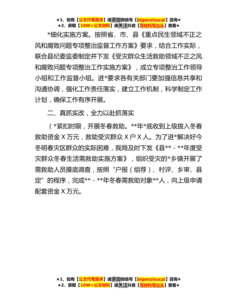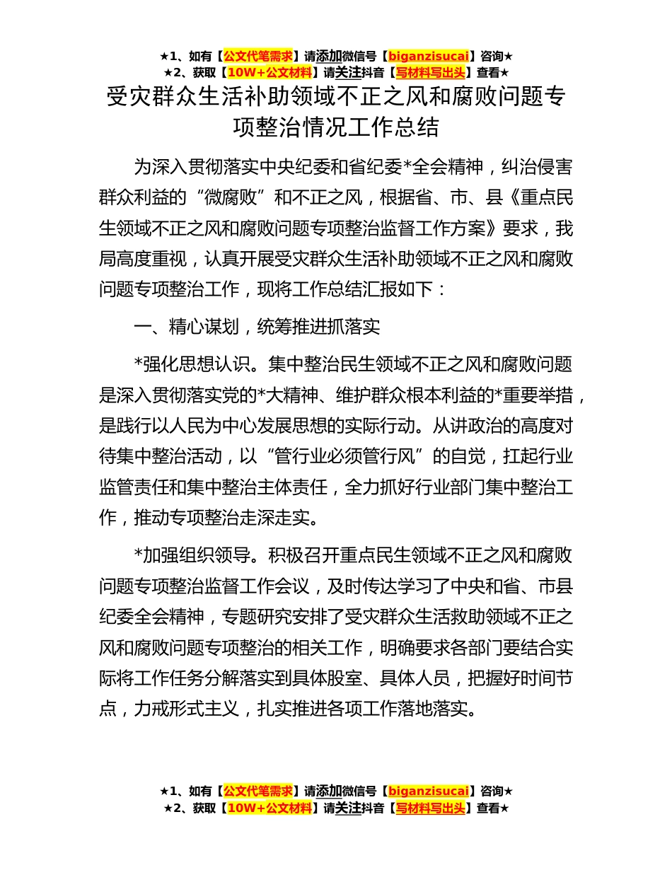 ★1、如有【公文代笔需求】请添加微信号【biganzisucai】咨询★★2、获取【10W+公文材料】请关注抖音【写材料写出头】查看★受灾群众生活补助领域不正之风和腐败问题专项整治情况工作总结为深入贯彻落实中央纪委和省纪委*全会精神,纠治侵害群众利益的“微腐败”和不正之风,根据省、市、县《重点民生领域不正之风和腐败问题专项整治监督工作方案》要求,我局高度重视,认真开展受灾群众生活补助领域不正之风和腐败问题专项整治工作,现将工作总结汇报如下:一、精心谋划,统筹推进抓落实*强化思想认识。集中整治民生领域不正之风和腐败问题是深入贯彻落实党的*大精神、维护群众根本利益的*重要举措,是践行以人民为中心发展思想的实际行动。从讲政治的高度对待集中整治活动,以“管行业必须管行风”的自觉,扛起...