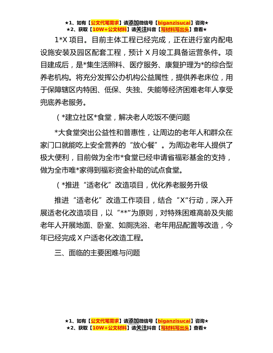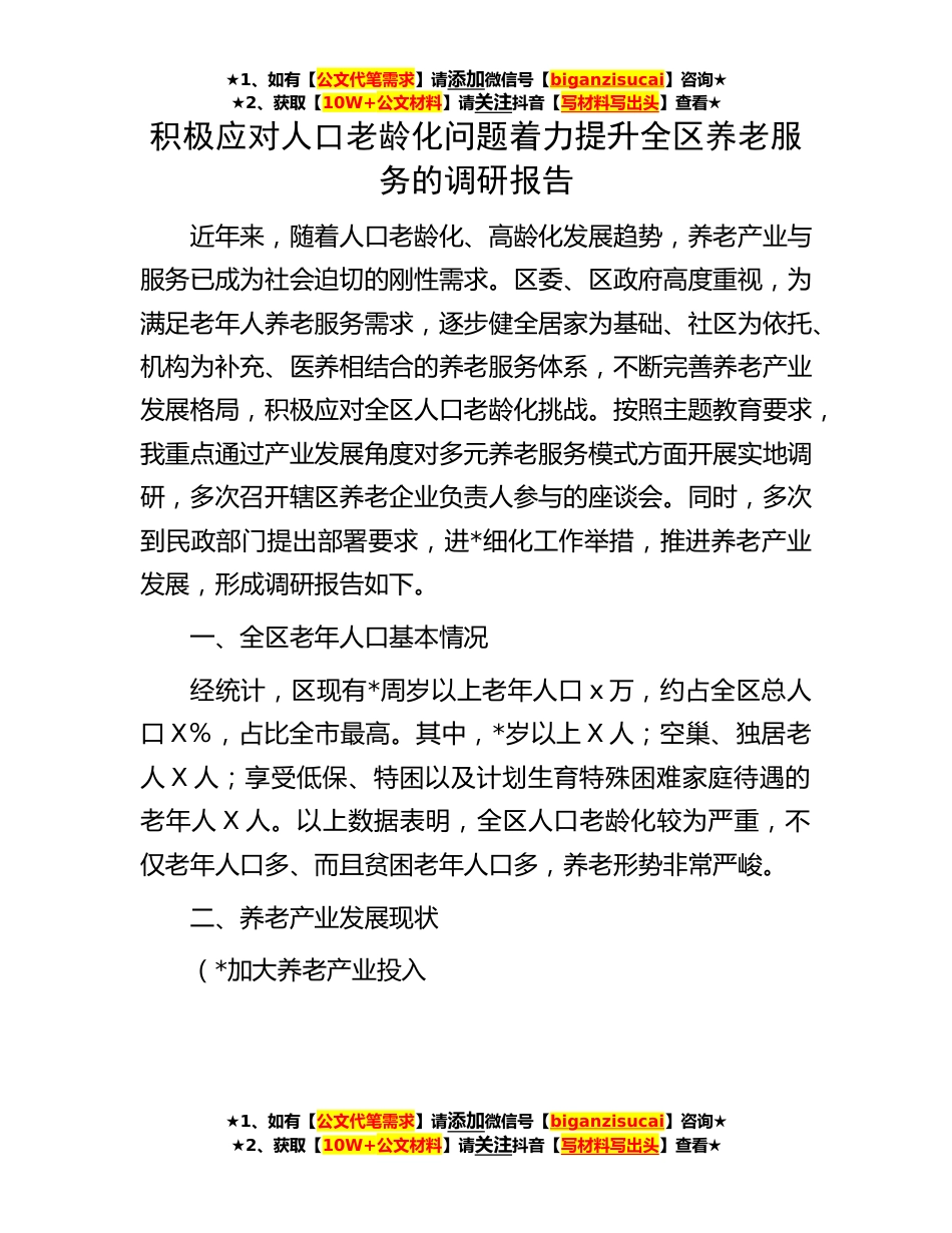 ★1、如有【公文代笔需求】请添加微信号【biganzisucai】咨询★★2、获取【10W+公文材料】请关注抖音【写材料写出头】查看★积极应对人口老龄化问题着力提升全区养老服务的调研报告近年来,随着人口老龄化、高龄化发展趋势,养老产业与服务已成为社会迫切的刚性需求。区委、区政府高度重视,为满足老年人养老服务需求,逐步健全居家为基础、社区为依托、机构为补充、医养相结合的养老服务体系,不断完善养老产业发展格局,积极应对全区人口老龄化挑战。按照主题教育要求,我重点通过产业发展角度对多元养老服务模式方面开展实地调研,多次召开辖区养老企业负责人参与的座谈会。同时,多次到民政部门提出部署要求,进*细化工作举措,推进养老产业发展,形成调研报告如下。一、全区老年人口基本情况经统计,区现有*...