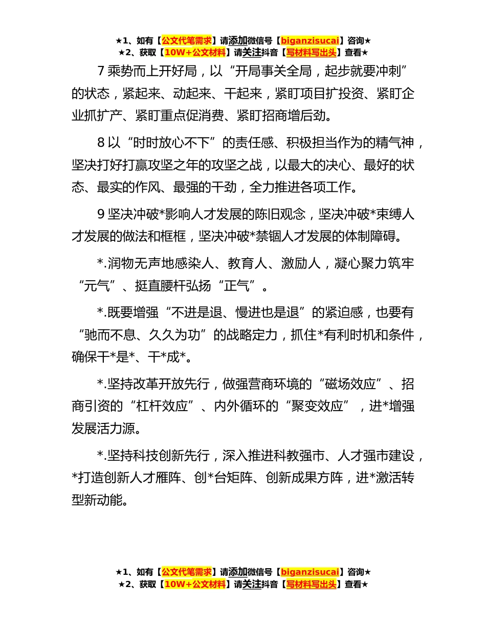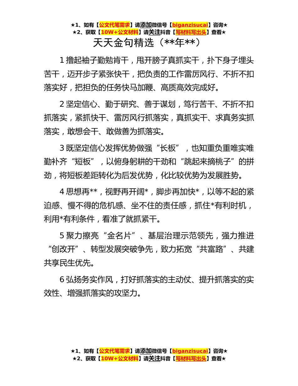 ★1、如有【公文代笔需求】请添加微信号【biganzisucai】咨询★★2、获取【10W+公文材料】请关注抖音【写材料写出头】查看★天天金句精选(**年**)1撸起袖子勤勉肯干,甩开膀子真抓实干,扑下身子埋头苦干,迈开步子紧张快干,把负责的工作雷厉风行、不折不扣落实好,把担负的任务快马加鞭、高质高效完成好。2坚定信心、勤于研究、善于谋划,笃行苦干、不折不扣抓落实,紧抓快干、雷厉风行抓落实,真抓实干、求真务实抓落实,敢想会干、敢做善为抓落实。3既坚定信心发挥优势做强“长板”,也知重负重唯实唯勤补齐“短板”,以俯身躬耕的干劲和“跳起来摘桃子”的拼劲,将短板差距转化为后发优势,化比较优势为发展胜势。4思想再**,视野再开阔*,脚步再加快*,以等不起的紧迫感、慢不得的危机感、坐不住的责任感...