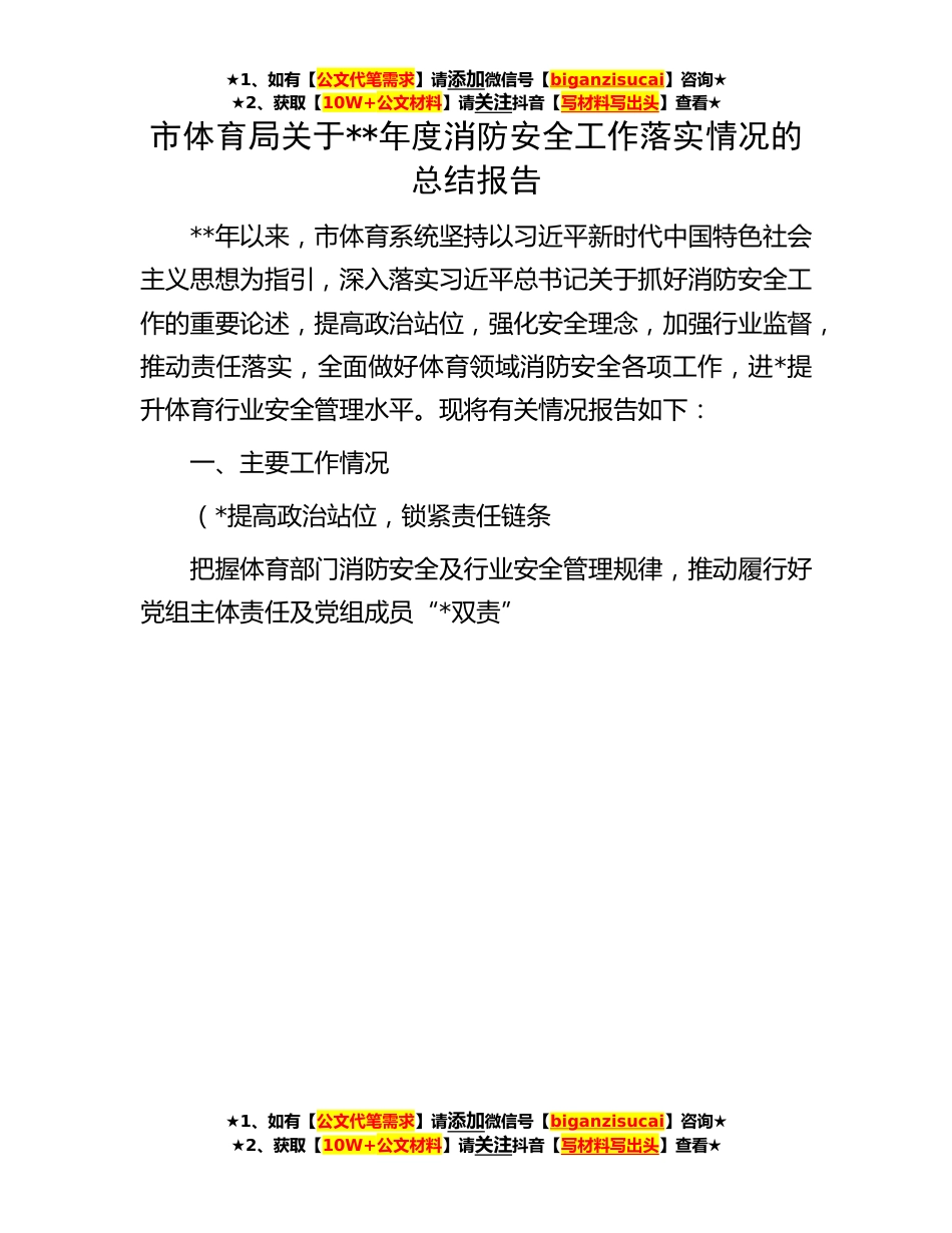 ★1、如有【公文代笔需求】请添加微信号【biganzisucai】咨询★★2、获取【10W+公文材料】请关注抖音【写材料写出头】查看★市体育局关于**年度消防安全工作落实情况的总结报告**年以来,市体育系统坚持以习近平新时代中国特色社会主义思想为指引,深入落实习近平总书记关于抓好消防安全工作的重要论述,提高政治站位,强化安全理念,加强行业监督,推动责任落实,全面做好体育领域消防安全各项工作,进*提升体育行业安全管理水平。现将有关情况报告如下:一、主要工作情况(*提高政治站位,锁紧责任链条把握体育部门消防安全及行业安全管理规律,推动履行好党组主体责任及党组成员“*双责”★1、如有【公文代笔需求】请添加微信号【biganzisucai】咨询★★2、获取【10W+公文材料】请关注抖音【写材料写出头】查看...