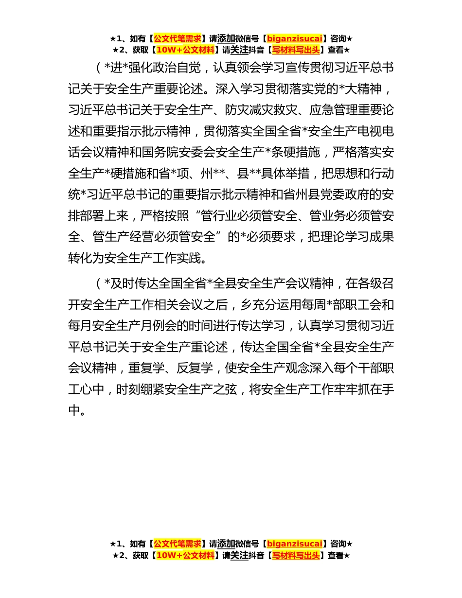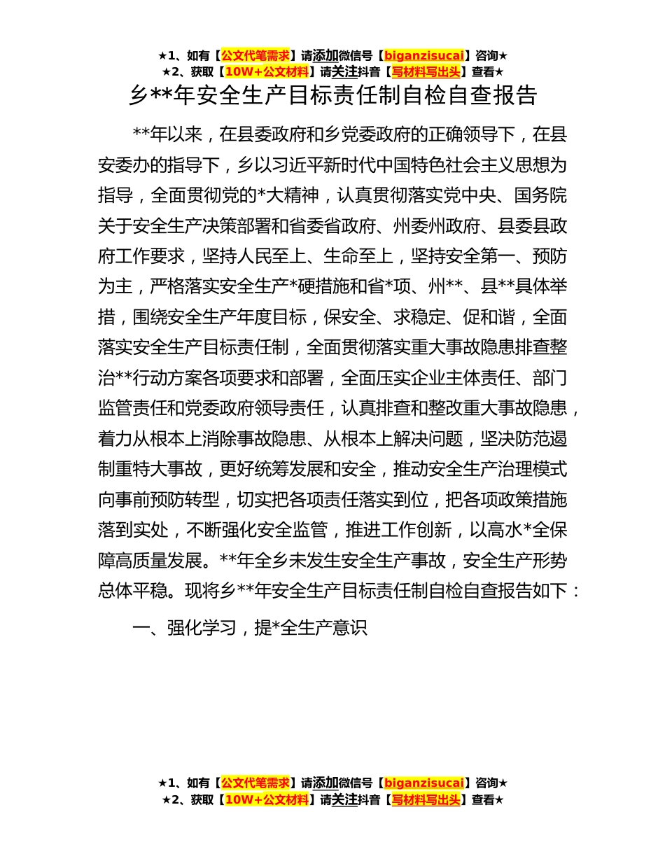 ★1、如有【公文代笔需求】请添加微信号【biganzisucai】咨询★★2、获取【10W+公文材料】请关注抖音【写材料写出头】查看★乡**年安全生产目标责任制自检自查报告**年以来,在县委政府和乡党委政府的正确领导下,在县安委办的指导下,乡以习近平新时代中国特色社会主义思想为指导,全面贯彻党的*大精神,认真贯彻落实党中央、国务院关于安全生产决策部署和省委省政府、州委州政府、县委县政府工作要求,坚持人民至上、生命至上,坚持安全第一、预防为主,严格落实安全生产*硬措施和省*项、州**、县**具体举措,围绕安全生产年度目标,保安全、求稳定、促和谐,全面落实安全生产目标责任制,全面贯彻落实重大事故隐患排查整治**行动方案各项要求和部署,全面压实企业主体责任、部门监管责任和党委政府领导责任,认...