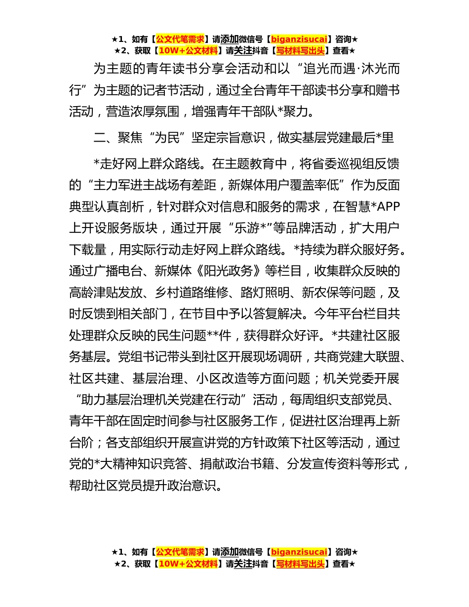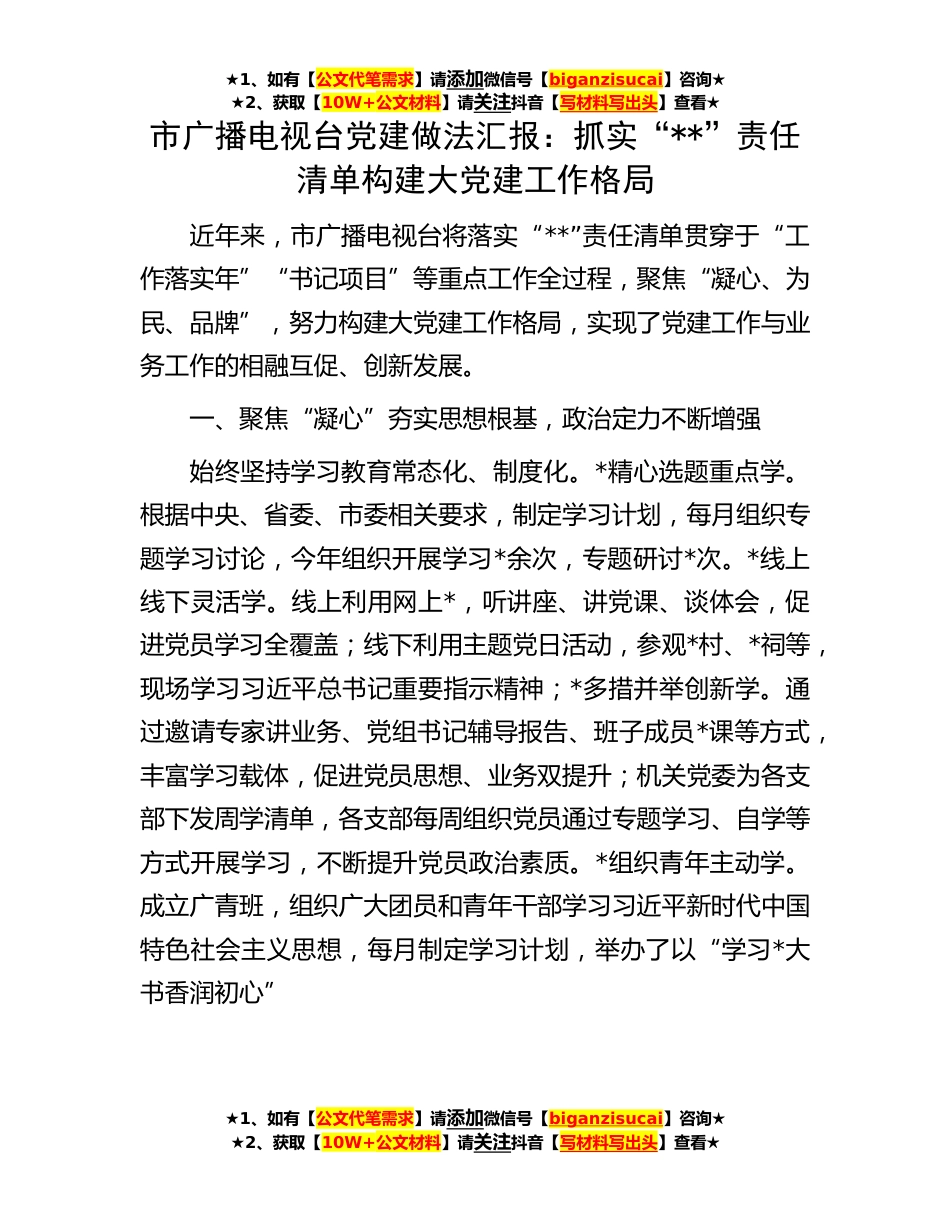 ★1、如有【公文代笔需求】请添加微信号【biganzisucai】咨询★★2、获取【10W+公文材料】请关注抖音【写材料写出头】查看★市广播电视台党建做法汇报:抓实“**”责任清单构建大党建工作格局近年来,市广播电视台将落实“**”责任清单贯穿于“工作落实年”“书记项目”等重点工作全过程,聚焦“凝心、为民、品牌”,努力构建大党建工作格局,实现了党建工作与业务工作的相融互促、创新发展。一、聚焦“凝心”夯实思想根基,政治定力不断增强始终坚持学习教育常态化、制度化。*精心选题重点学。根据中央、省委、市委相关要求,制定学习计划,每月组织专题学习讨论,今年组织开展学习*余次,专题研讨*次。*线上线下灵活学。线上利用网上*,听讲座、讲党课、谈体会,促进党员学习全覆盖;线下利用主题党日活动,参观...
