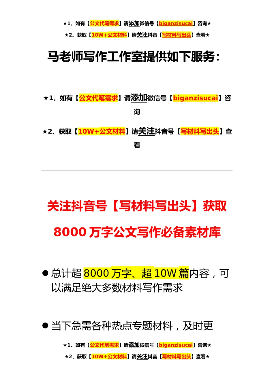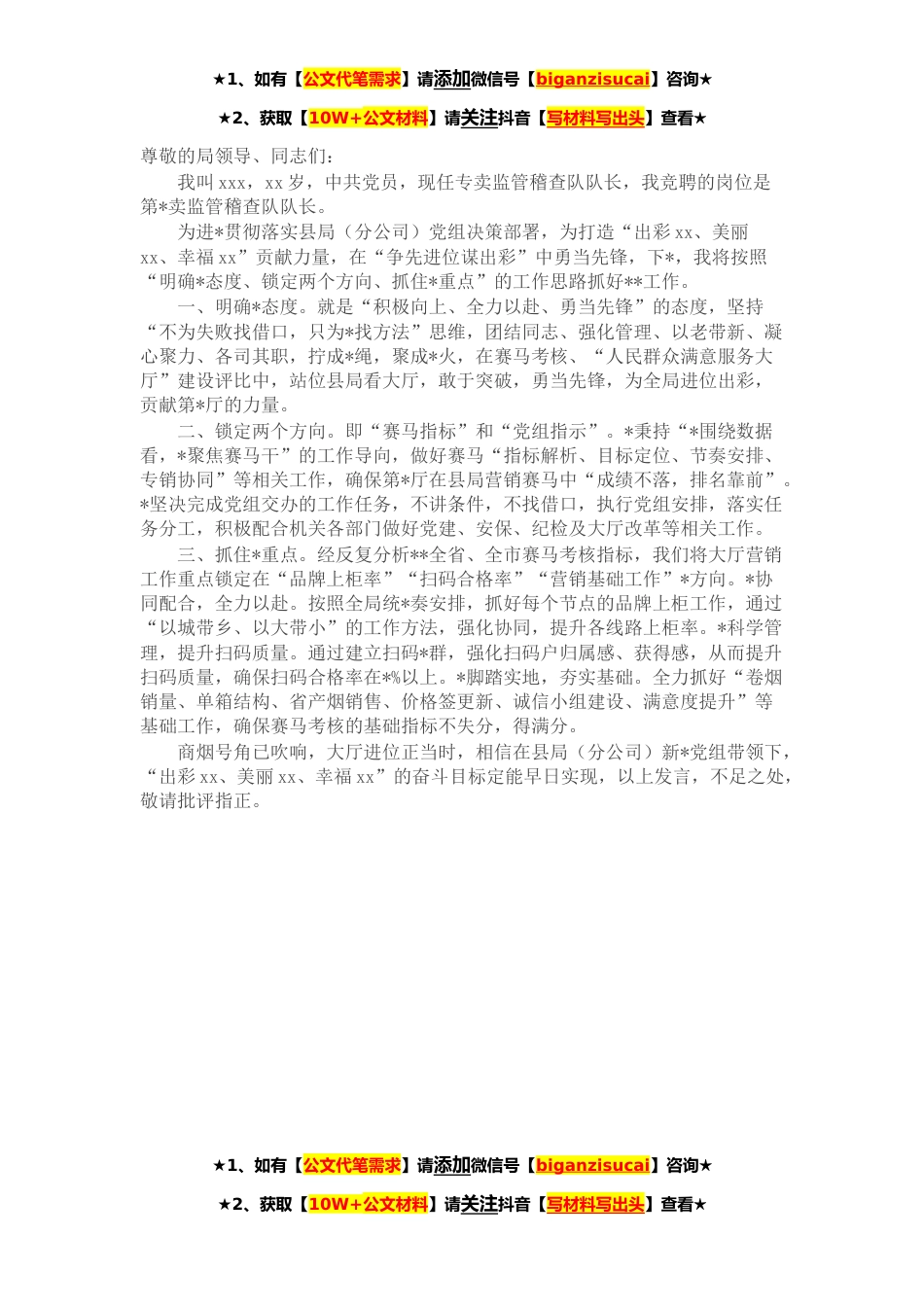 ★1、如有【公文代笔需求】请添加微信号【biganzisucai】咨询★★2、获取【10W+公文材料】请关注抖音【写材料写出头】查看★尊敬的局领导、同志们:我叫xxx,xx岁,中共党员,现任专卖监管稽查队队长,我竞聘的岗位是第*卖监管稽查队队长。为进*贯彻落实县局(分公司)党组决策部署,为打造“出彩xx、美丽xx、幸福xx”贡献力量,在“争先进位谋出彩”中勇当先锋,下*,我将按照“明确*态度、锁定两个方向、抓住*重点”的工作思路抓好**工作。一、明确*态度。就是“积极向上、全力以赴、勇当先锋”的态度,坚持“不为失败找借口,只为*找方法”思维,团结同志、强化管理、以老带新、凝心聚力、各司其职,拧成*绳,聚成*火,在赛马考核、“人民群众满意服务大厅”建设评比中,站位县局看大厅,敢于突破,勇当先锋,...