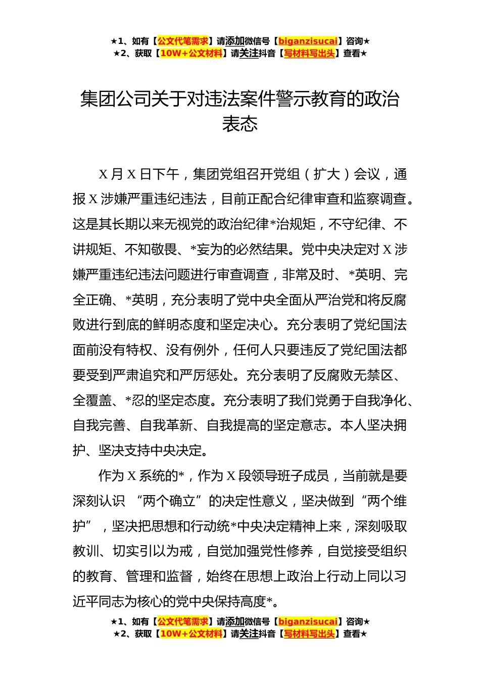 ★1、如有【公文代笔需求】请添加微信号【biganzisucai】咨询★★2、获取【10W+公文材料】请关注抖音【写材料写出头】查看★集团公司关于对违法案件警示教育的政治表态X月X日下午,集团党组召开党组(扩大)会议,通报X涉嫌严重违纪违法,目前正配合纪律审查和监察调查。这是其长期以来无视党的政治纪律*治规矩,不守纪律、不讲规矩、不知敬畏、*妄为的必然结果。党中央决定对X涉嫌严重违纪违法问题进行审查调查,非常及时、*英明、完全正确、*英明,充分表明了党中央全面从严治党和将反腐败进行到底的鲜明态度和坚定决心。充分表明了党纪国法面前没有特权、没有例外,任何人只要违反了党纪国法都要受到严肃追究和严厉惩处。充分表明了反腐败无禁区、全覆盖、*忍的坚定态度。充分表明了我们党勇于自我净化、自我完...