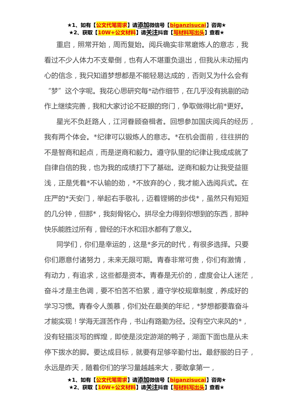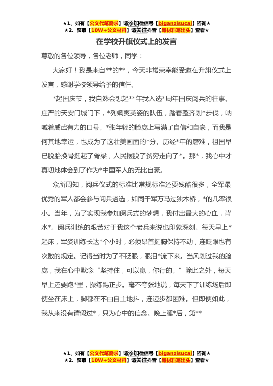 ★1、如有【公文代笔需求】请添加微信号【biganzisucai】咨询★★2、获取【10W+公文材料】请关注抖音【写材料写出头】查看★在学校升旗仪式上的发言尊敬的各位领导,各位老师,同学:大家好!我是来自**的**,今天非常荣幸能受邀在升旗仪式上发言,感谢学校领导给予的信任。*起国庆节,我自然会想起**年我入选*周年国庆阅兵的往事。庄严的天安门城门下,*列飒爽英姿的队伍,踏着整齐划*步伐,呐喊着威武有力的口号。*张年轻的脸庞上写满了自信和自豪,而我是何其地幸运,也成为了这壮美画面的*分。历经*年的磨难,祖国早已脱胎换骨挺起了脊梁,人民摆脱了贫穷走向了*。那*,我心中才真切地体会到了作为*中国军人的无比自豪。众所周知,阅兵仪式的标准比常规标准还要残酷很多,全军最优秀的军人都会参与阅兵遴选,...