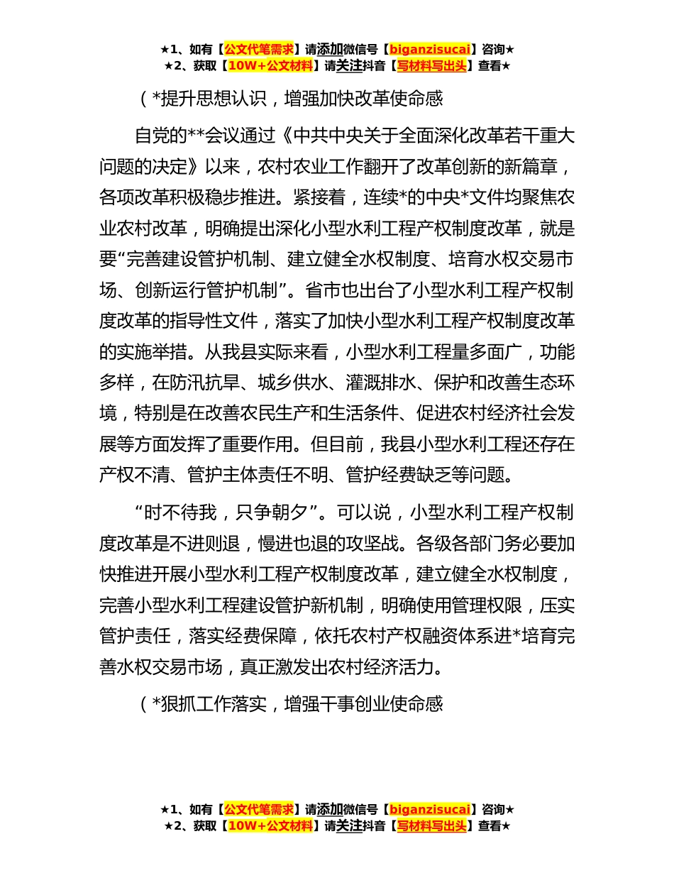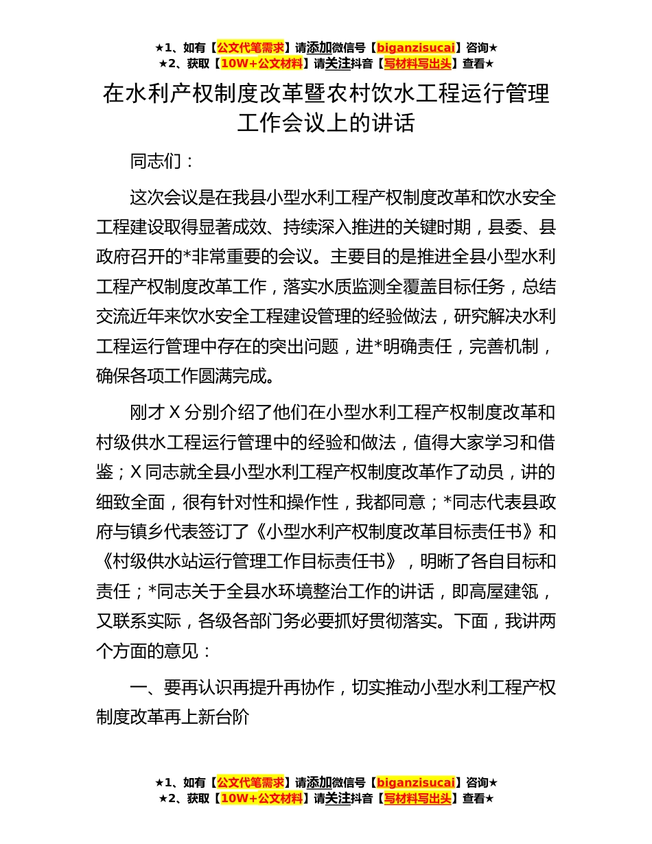 ★1、如有【公文代笔需求】请添加微信号【biganzisucai】咨询★★2、获取【10W+公文材料】请关注抖音【写材料写出头】查看★在水利产权制度改革暨农村饮水工程运行管理工作会议上的讲话同志们:这次会议是在我县小型水利工程产权制度改革和饮水安全工程建设取得显著成效、持续深入推进的关键时期,县委、县政府召开的*非常重要的会议。主要目的是推进全县小型水利工程产权制度改革工作,落实水质监测全覆盖目标任务,总结交流近年来饮水安全工程建设管理的经验做法,研究解决水利工程运行管理中存在的突出问题,进*明确责任,完善机制,确保各项工作圆满完成。刚才X分别介绍了他们在小型水利工程产权制度改革和村级供水工程运行管理中的经验和做法,值得大家学习和借鉴;X同志就全县小型水利工程产权制度改革作了...