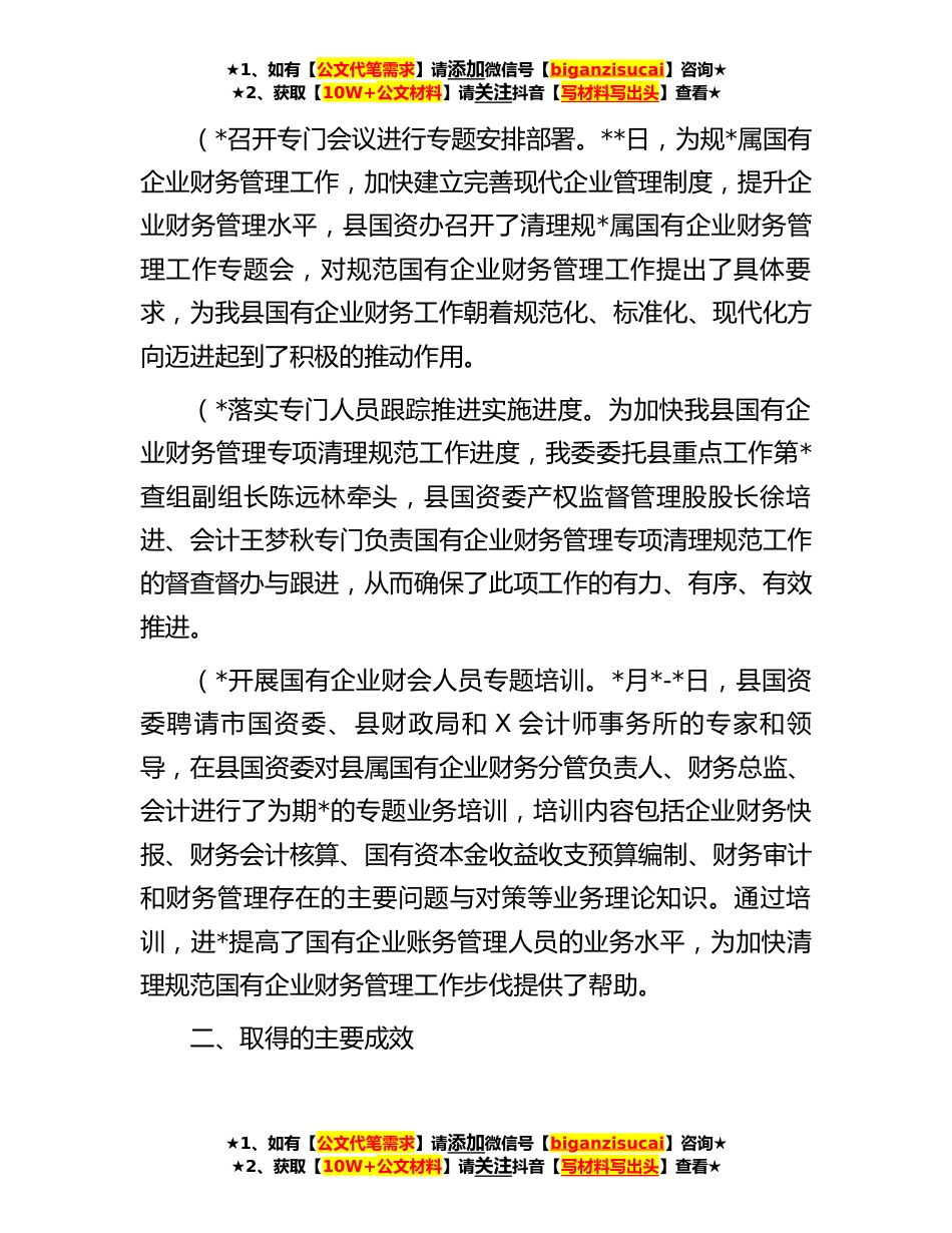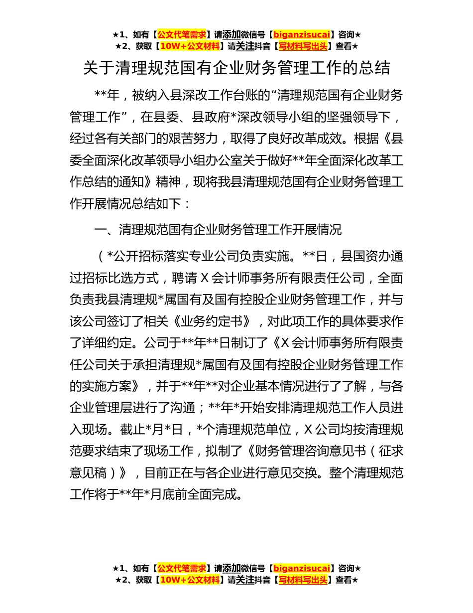 ★1、如有【公文代笔需求】请添加微信号【biganzisucai】咨询★★2、获取【10W+公文材料】请关注抖音【写材料写出头】查看★关于清理规范国有企业财务管理工作的总结**“年,被纳入县深改工作台账的清理规范国有企业财务”管理工作,在县委、县政府*深改领导小组的坚强领导下,经过各有关部门的艰苦努力,取得了良好改革成效。根据《县委全面深化改革领导小组办公室关于做好**年全面深化改革工作总结的通知》精神,现将我县清理规范国有企业财务管理工作开展情况总结如下:一、清理规范国有企业财务管理工作开展情况(*公开招标落实专业公司负责实施。**日,县国资办通过招标比选方式,聘请X会计师事务所有限责任公司,全面负责我县清理规*属国有及国有控股企业财务管理工作,并与该公司签订了相关《业务约定书》...