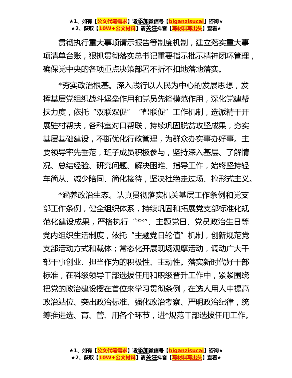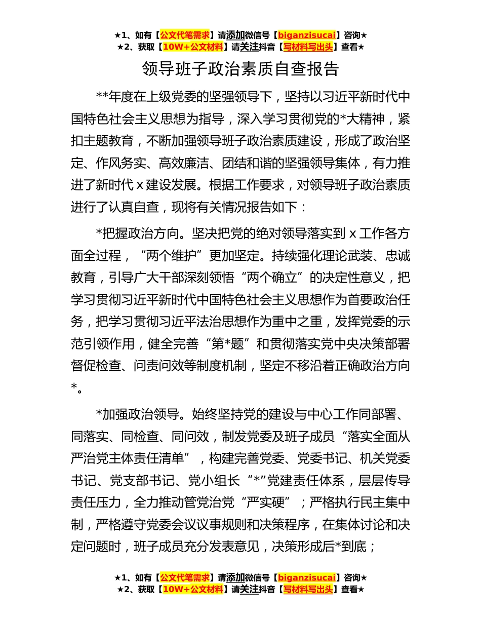 ★1、如有【公文代笔需求】请添加微信号【biganzisucai】咨询★★2、获取【10W+公文材料】请关注抖音【写材料写出头】查看★领导班子政治素质自查报告**年度在上级党委的坚强领导下,坚持以习近平新时代中国特色社会主义思想为指导,深入学习贯彻党的*大精神,紧扣主题教育,不断加强领导班子政治素质建设,形成了政治坚定、作风务实、高效廉洁、团结和谐的坚强领导集体,有力推进了新时代x建设发展。根据工作要求,对领导班子政治素质进行了认真自查,现将有关情况报告如下:*把握政治方向。坚决把党的绝对领导落实到x工作各方面全过程,“两个维护”更加坚定。持续强化理论武装、忠诚教育,引导广大干部深刻领悟“两个确立”的决定性意义,把学习贯彻习近平新时代中国特色社会主义思想作为首要政治任务,把学习...