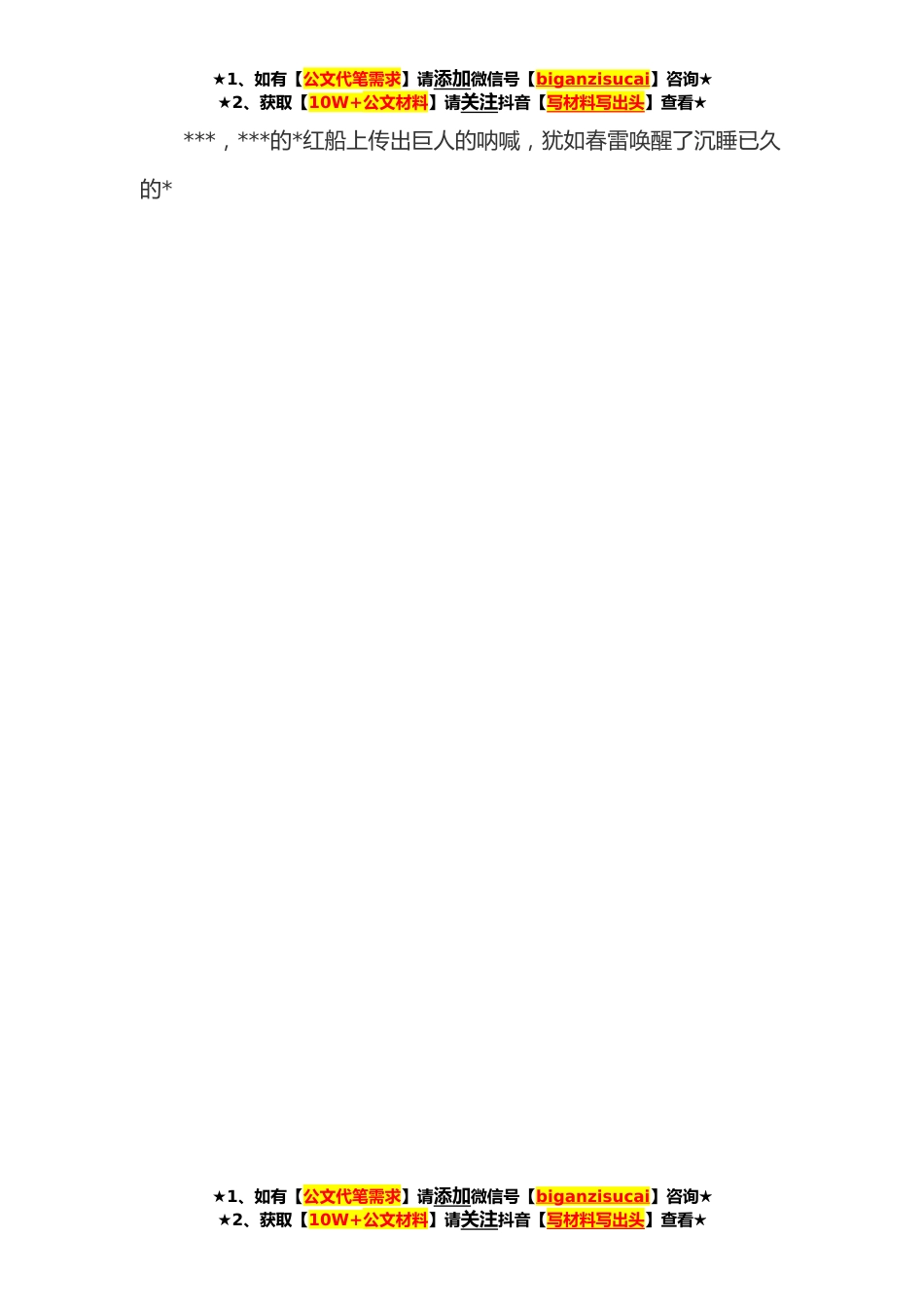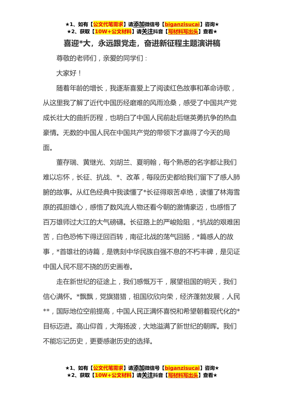 ★1、如有【公文代笔需求】请添加微信号【biganzisucai】咨询★★2、获取【10W+公文材料】请关注抖音【写材料写出头】查看★喜迎*大,永远跟党走,奋进新征程主题演讲稿尊敬的老师们,亲爱的同学们∶大家好!随着年龄的增长,我逐渐喜爱上了阅读红色故事和革命诗歌,从这里我了解了近代中国历经磨难的风雨沧桑,感受了中国共产党成长壮大的曲折历程,也明白了中国人民前赴后继英勇抗争的热血豪情。无数的中国人民在中国共产党的带领下才赢得了今天的局面。董存瑞、黄继光、刘胡兰、夏明翰,每个熟悉的名字都让我们难以忘怀,长征、抗战、*、改革,每段历史都给我们留下了感人肺腑的故事。从红色经典中我读懂了*长征得艰苦卓绝,读懂了林海雪原的孤胆雄心,感悟了数风流人物还看今朝的激情豪迈,也感悟了百万雄师过...