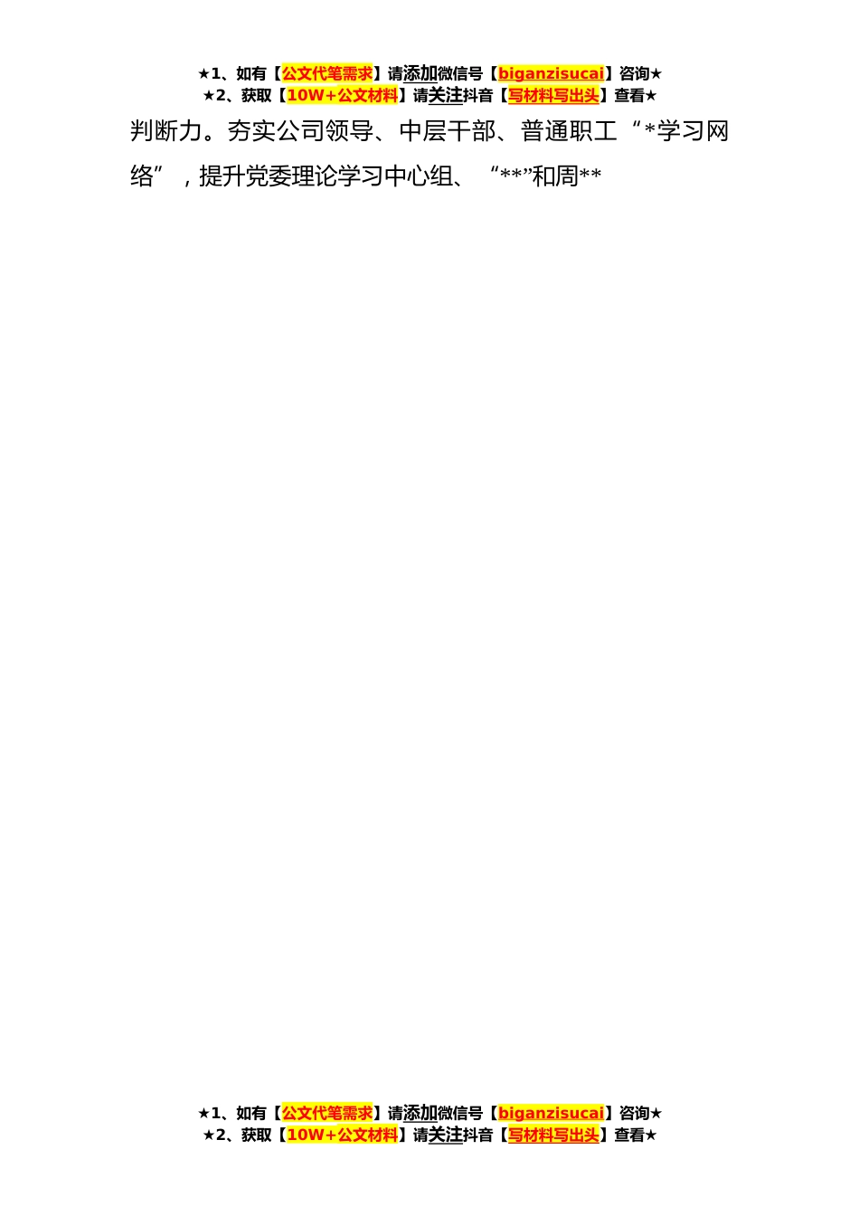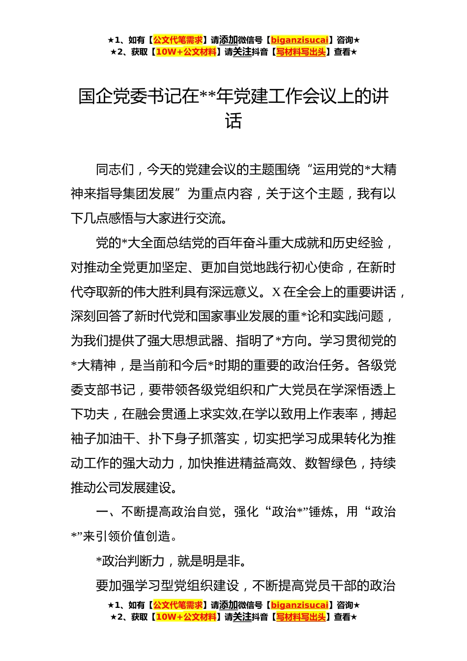 ★1、如有【公文代笔需求】请添加微信号【biganzisucai】咨询★★2、获取【10W+公文材料】请关注抖音【写材料写出头】查看★国企党委书记在**年党建工作会议上的讲话同志们,今天的党建会议的主题围绕“运用党的*大精神来指导集团发展”为重点内容,关于这个主题,我有以下几点感悟与大家进行交流。党的*大全面总结党的百年奋斗重大成就和历史经验,对推动全党更加坚定、更加自觉地践行初心使命,在新时代夺取新的伟大胜利具有深远意义。X在全会上的重要讲话,深刻回答了新时代党和国家事业发展的重*论和实践问题,为我们提供了强大思想武器、指明了*方向。学习贯彻党的*大精神,是当前和今后*时期的重要的政治任务。各级党委支部书记,要带领各级党组织和广大党员在学深悟透上下功夫,在融会贯通上求实效,在学以...