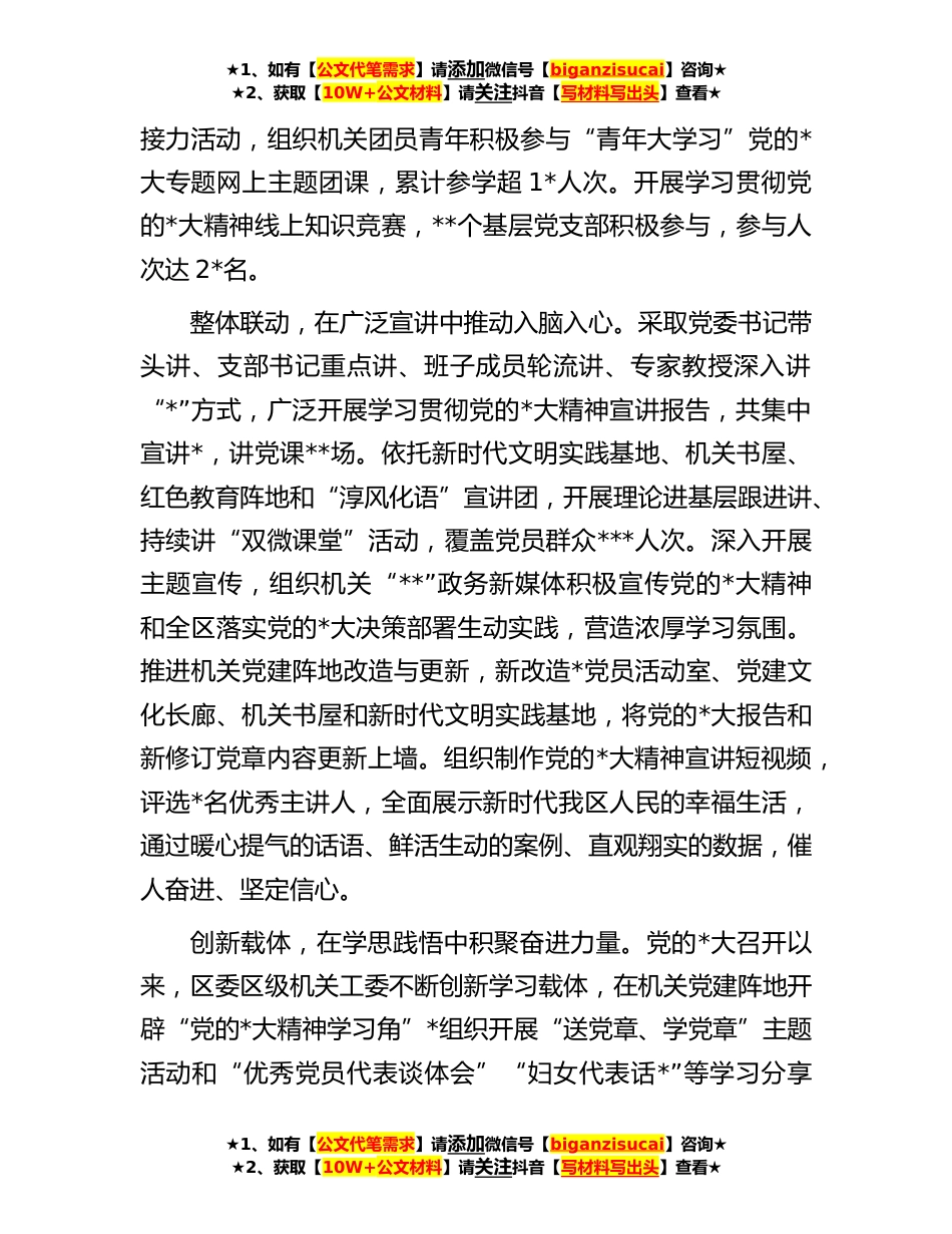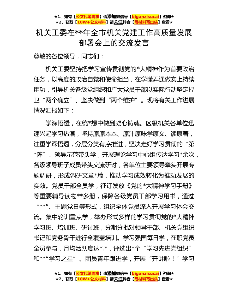★1、如有【公文代笔需求】请添加微信号【biganzisucai】咨询★★2、获取【10W+公文材料】请关注抖音【写材料写出头】查看★机关工委在**年全市机关党建工作高质量发展部署会上的交流发言尊敬的各位领导,同志们:机关工委坚持把学习宣传贯彻党的*大精神作为首要政治任务,以高度的政治自觉和使命担当,在学懂弄通做实上持续用功,引导机关各级党组织和广大党员干部以实际行动坚定捍卫“两个确立”、坚决做到“两个维护”。现将有关工作进展情况汇报如下:学深悟透,在统*想中做到凝心铸魂。区级机关各单位迅速兴起学习热潮,坚持原原本本、原汁原味学原文、读原著,注重学深悟透,分层分类有序推进,坚决走好学习贯彻的“第*阵”。领导示范带头学,开展理论学习中心组传达学习*余次,各级领导班子成员带头交流研...