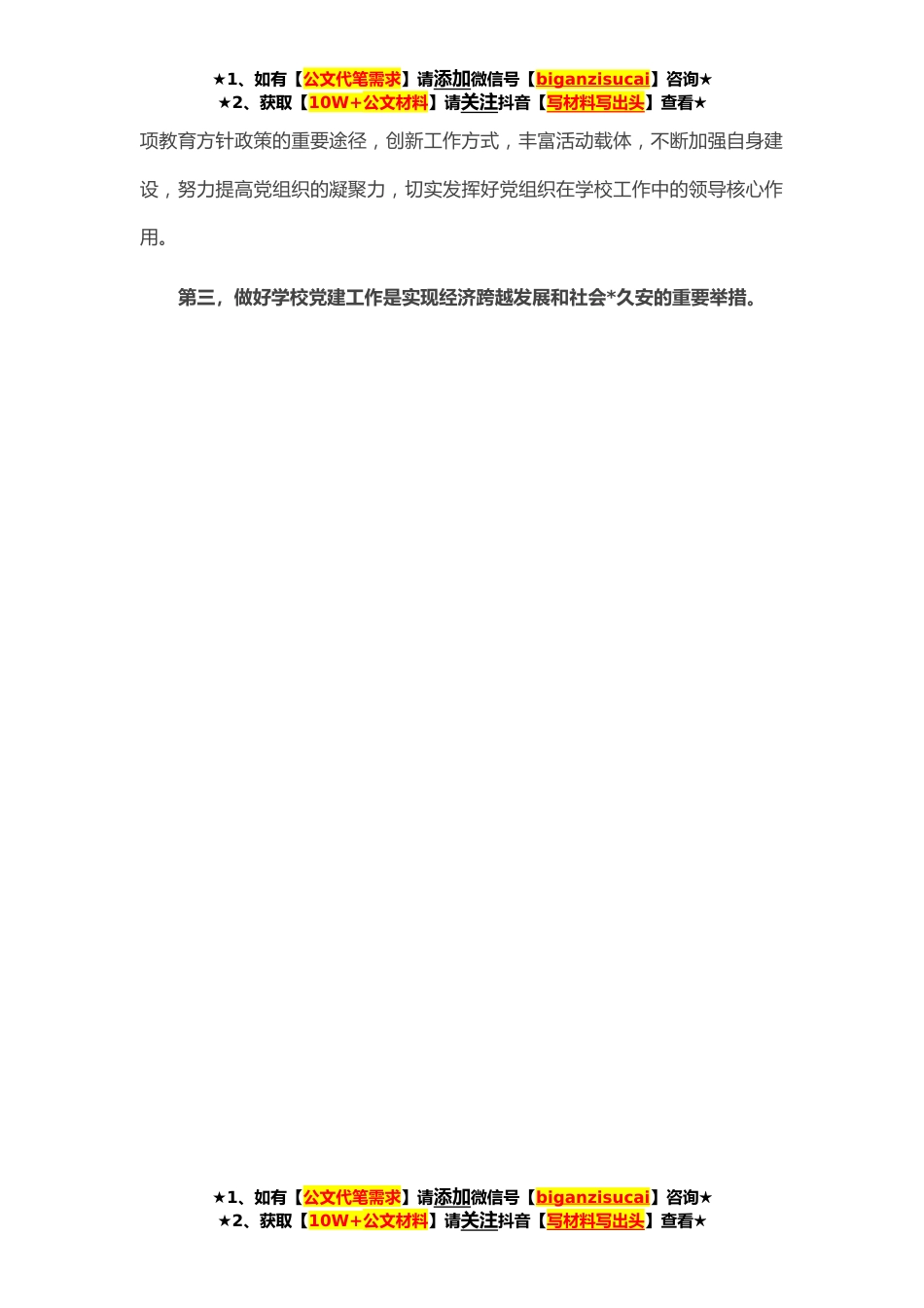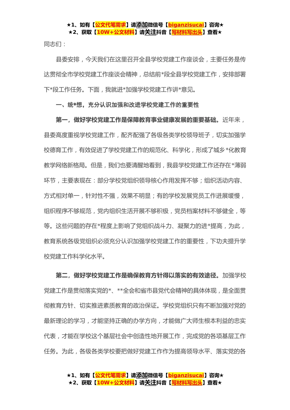★1、如有【公文代笔需求】请添加微信号【biganzisucai】咨询★★2、获取【10W+公文材料】请关注抖音【写材料写出头】查看★同志们:县委安排,今天我们在这里召开全县学校党建工作座谈会,主要任务是传达贯彻全市学校党建工作座谈会精神,总结前*段全县学校党建工作,安排部署下*段工作任务。下面,我就进*加强学校党建工作讲*意见。一、统*想,充分认识加强和改进学校党建工作的重要性第一,做好学校党建工作是保障教育事业健康发展的重要基础。近年来,县委高度重视学校党建工作,配齐配强了各级各类学校领导班子,切实加强学校德育工作,有效促进了学校党建工作的规范化、科学化,形成了城乡*化教育教学网络新格局。但是,我们也要清醒地看到,我县学校党建工作还存在*薄弱环节,主要表现在:部分学校党组织领...