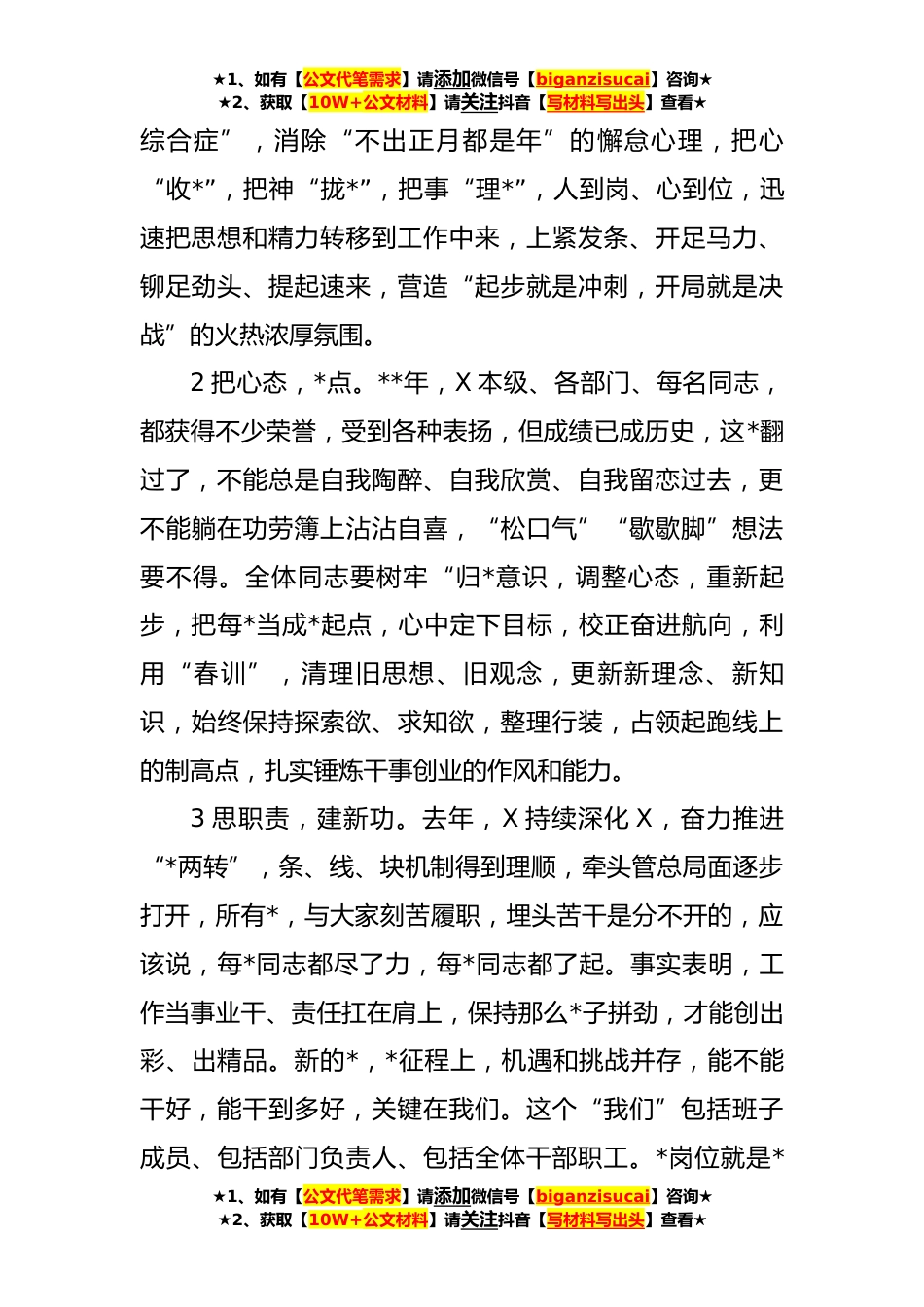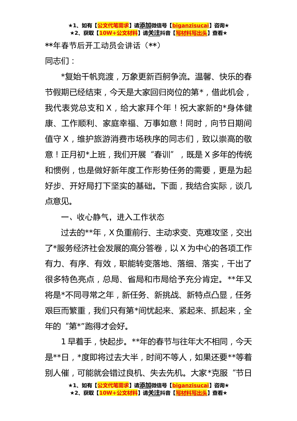 ★1、如有【公文代笔需求】请添加微信号【biganzisucai】咨询★★2、获取【10W+公文材料】请关注抖音【写材料写出头】查看★**年春节后开工动员会讲话(**)同志们:*复始千帆竞渡,万象更新百舸争流。温馨、快乐的春节假期已经结束,今天是大家回归岗位的第*,借此机会,我代表党总支和X,给大家拜个年!祝大家新的*身体健康、工作顺利、家庭幸福、万事如意!同时,向节日期间值守X,维护旅游消费市场秩序的同志们,致以崇高的敬意!正月初*上班,我们开展“春训”,既是X多年的传统和惯例,也是做好新年度工作形势任务的需要,更是为起好步、开好局打下坚实的基础。下面,我结合实际,谈几点意见。一、收心静气,进入工作状态过去的**年,X负重前行、主动求变、克难攻坚,交出了*服务经济社会发展的高分答卷,以...