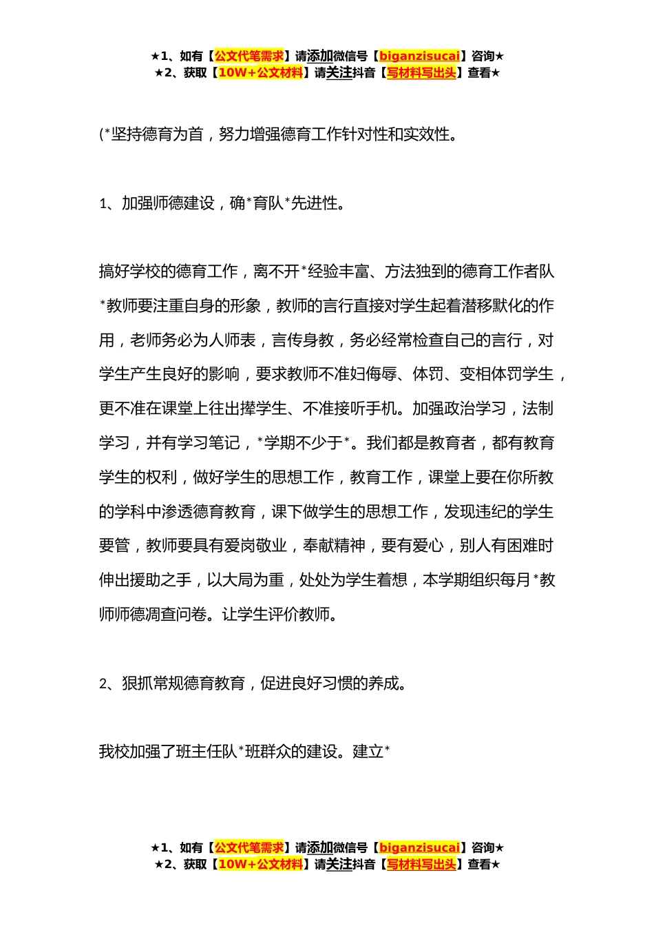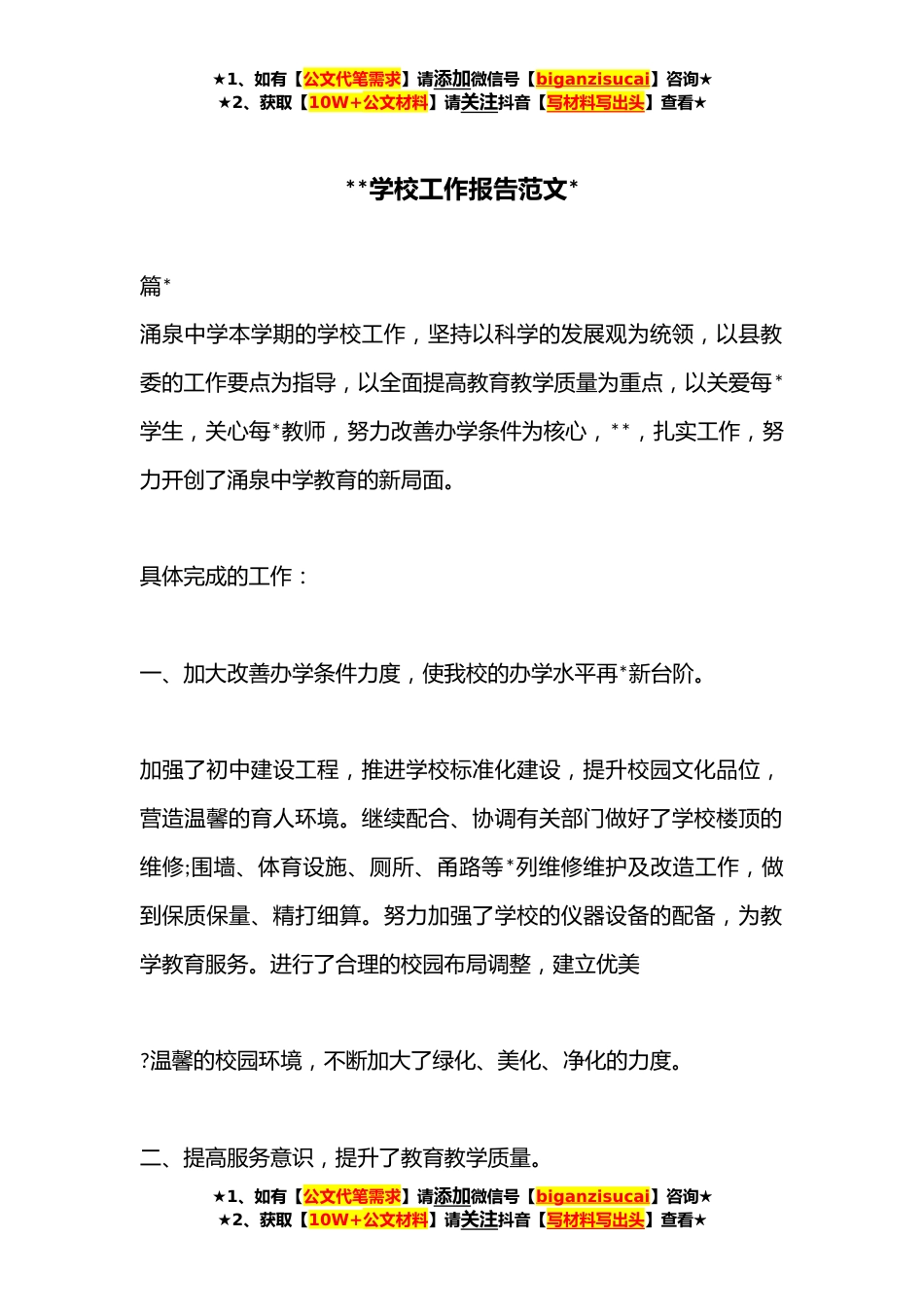 ★1、如有【公文代笔需求】请添加微信号【biganzisucai】咨询★★2、获取【10W+公文材料】请关注抖音【写材料写出头】查看★**学校工作报告范文*篇*涌泉中学本学期的学校工作,坚持以科学的发展观为统领,以县教委的工作要点为指导,以全面提高教育教学质量为重点,以关爱每*学生,关心每*教师,努力改善办学条件为核心,**,扎实工作,努力开创了涌泉中学教育的新局面。具体完成的工作:一、加大改善办学条件力度,使我校的办学水平再*新台阶。加强了初中建设工程,推进学校标准化建设,提升校园文化品位,营造温馨的育人环境。继续配合、协调有关部门做好了学校楼顶的维修;围墙、体育设施、厕所、甬路等*列维修维护及改造工作,做到保质保量、精打细算。努力加强了学校的仪器设备的配备,为教学教育服务。进行了...