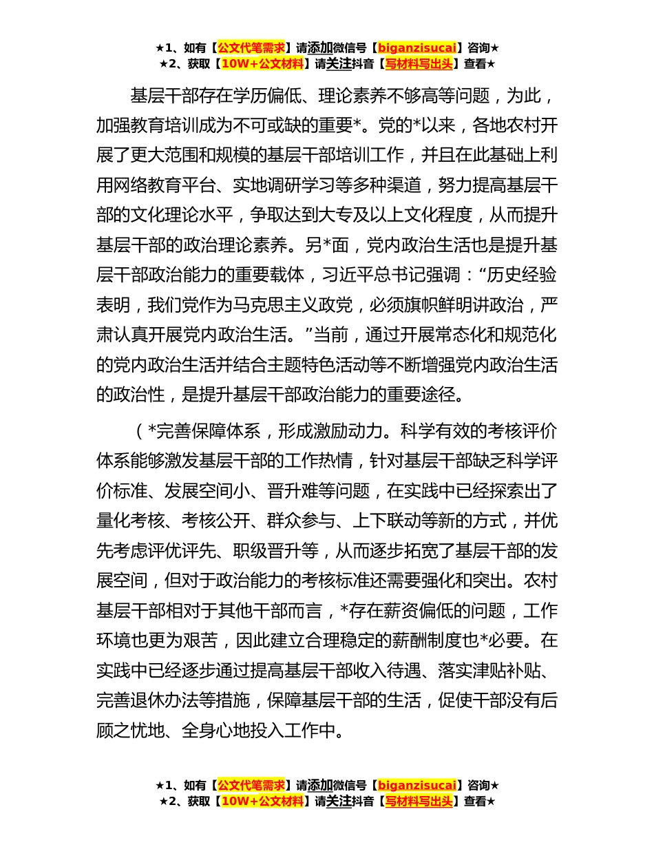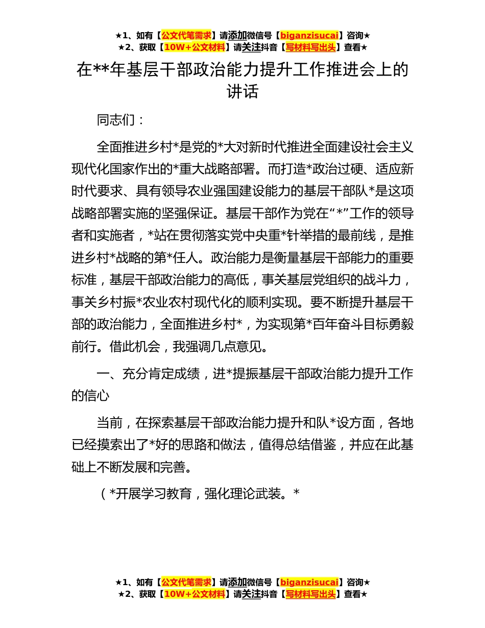 ★1、如有【公文代笔需求】请添加微信号【biganzisucai】咨询★★2、获取【10W+公文材料】请关注抖音【写材料写出头】查看★在**年基层干部政治能力提升工作推进会上的讲话同志们:全面推进乡村*是党的*大对新时代推进全面建设社会主义现代化国家作出的*重大战略部署。而打造*政治过硬、适应新时代要求、具有领导农业强国建设能力的基层干部队*是这项“战略部署实施的坚强保证。基层干部作为党在*”工作的领导者和实施者,*站在贯彻落实党中央重*针举措的最前线,是推进乡村*战略的第*任人。政治能力是衡量基层干部能力的重要标准,基层干部政治能力的高低,事关基层党组织的战斗力,事关乡村振*农业农村现代化的顺利实现。要不断提升基层干部的政治能力,全面推进乡村*,为实现第*百年奋斗目标勇毅前行。借此机会...