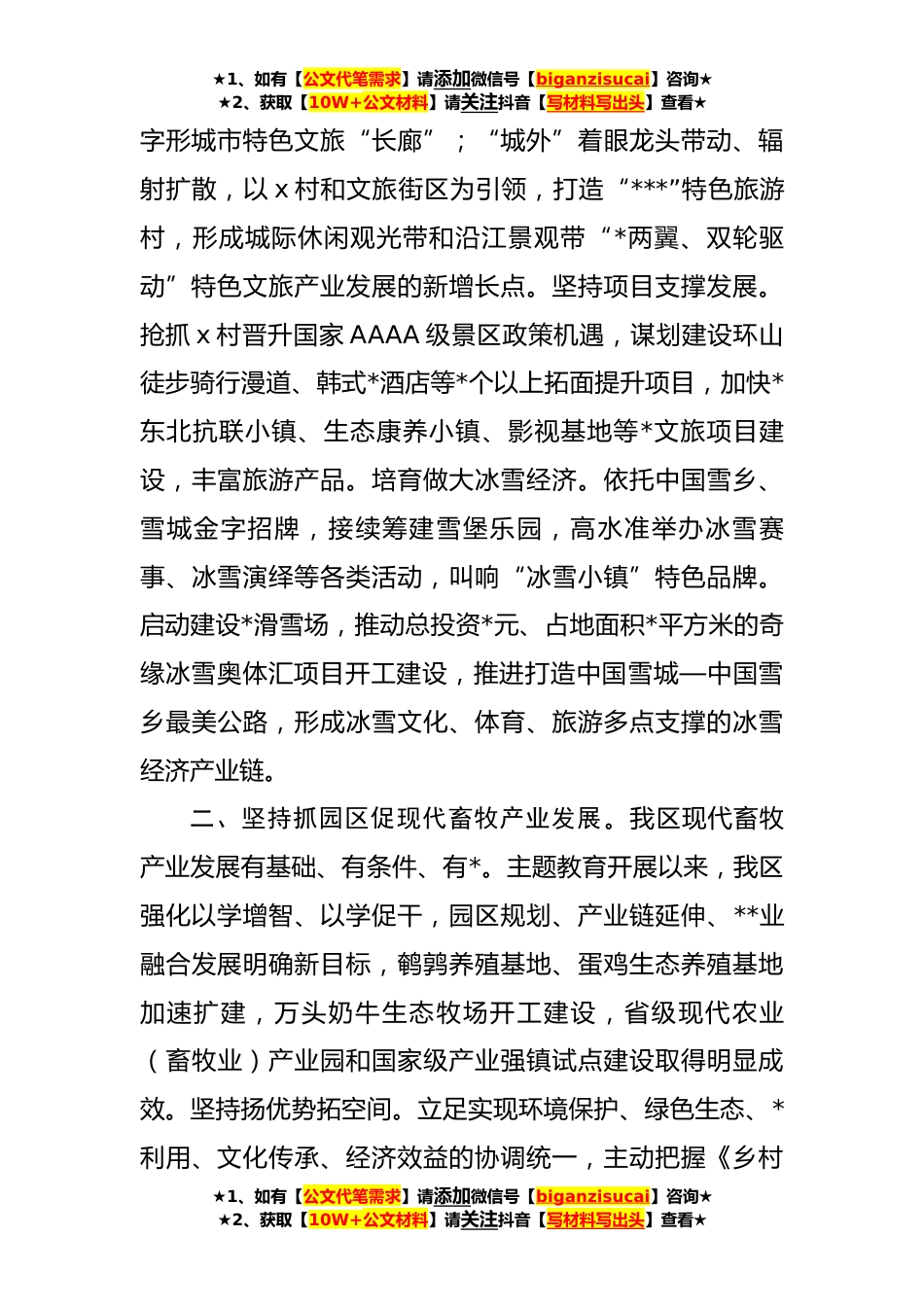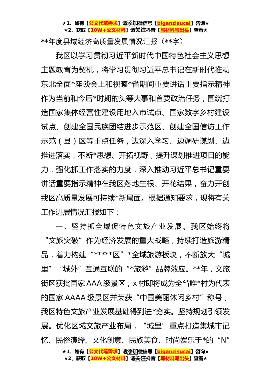 ★1、如有【公文代笔需求】请添加微信号【biganzisucai】咨询★★2、获取【10W+公文材料】请关注抖音【写材料写出头】查看★**年度县域经济高质量发展情况汇报(**字)我区以学习贯彻习近平新时代中国特色社会主义思想主题教育为契机,将学习贯彻习近平总书记在新时代推动东北全面*座谈会上和视察*省期间重要讲话重要指示精神作为当前和今后*时期的头等大事和首要政治任务,围绕打造国家集体经营性建设用地入市试点、国家数字乡村建设试点、创建全国民族团结进步示范区、创建全国信访工作示范(县)区等重点任务,边深入学习、边调研谋划、边推进落实,不断*思想、开拓视野,提升谋划推进项目的能力,强化抓工作落实的力度,深入推动习近平总书记重要讲话重要指示精神在我区落地生根、开花结果,奋力开创我区高质...