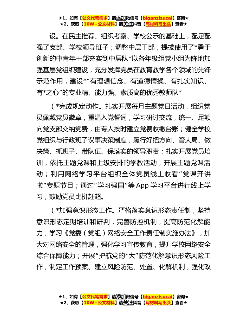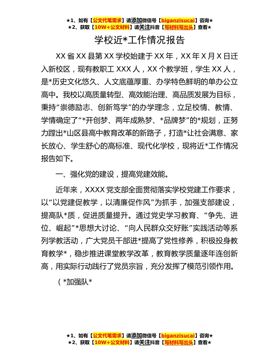 ★1、如有【公文代笔需求】请添加微信号【biganzisucai】咨询★★2、获取【10W+公文材料】请关注抖音【写材料写出头】查看★学校近*工作情况报告XX省XX县第XX学校始建于XX年,XX年X月X日迁入新校区,现有教职工XXX人,XX个教学班,学生XX人,是*历史文化悠久、人文底蕴厚重、办学特色鲜明的单办公立高中。我校以高质量转型、高效能治理、高品质发展为目标,“”秉持崇德励志、创新笃学的办学理念,立足校情、教情、“学情确定了*开创梦、两年成熟梦、*”品牌梦的*规划,正努力蹚出*山区县高中教育改革的新路子,打造*让社会满意、家长放心、学生舒心的高标准、现代化学校,现将近*工作情况报告如下。一、强化党的建设,提高党建效能。近年来,XXXX党支部全面贯彻落实学校党建工作要求,“”以以党建促教学,以清廉...